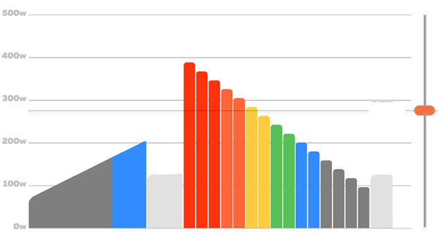 예를 들어, Zwift에서는 초기 100와트에서 시작하여 매 1분마다 20와트씩 증가시키며, 더 이상 페달링을 지속할 수 없게 될 때까지 계속합니다.
