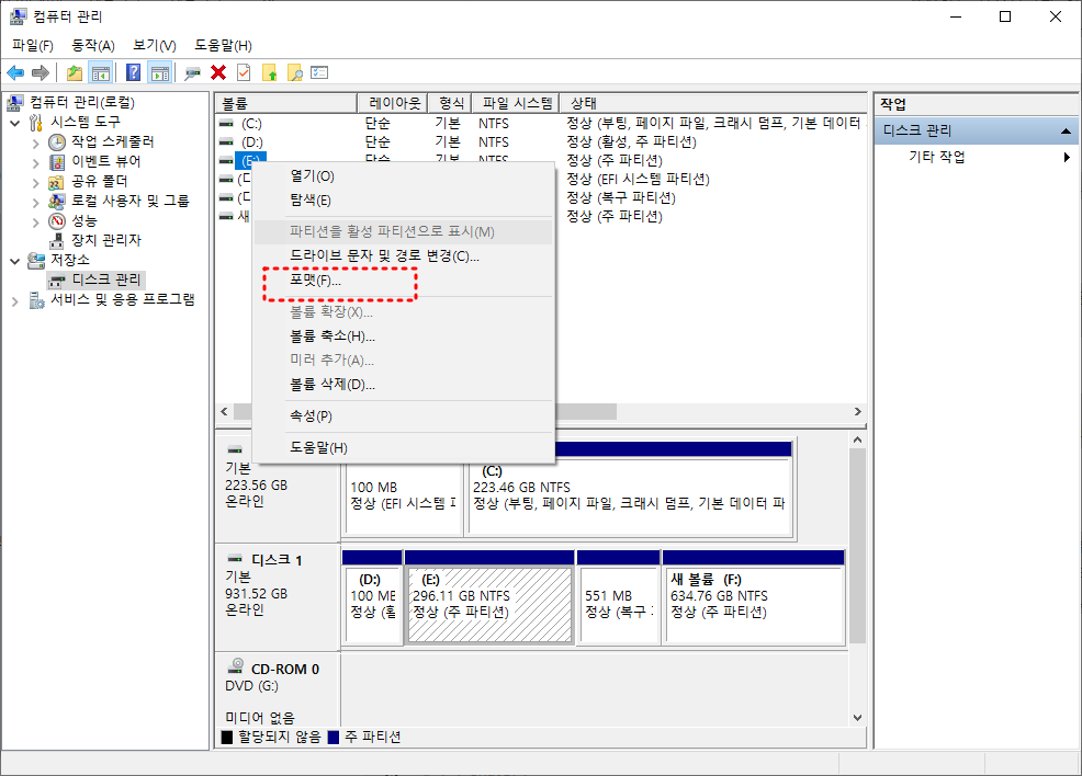 '관리 도구', '컴퓨터 관리', '디스크 관리'를 차례로 선택 후 포맷할 HDD, USB, SSD 등 파티션을 선택 후 오른쪽 클릭하고 '포맷'을 선택합니다.