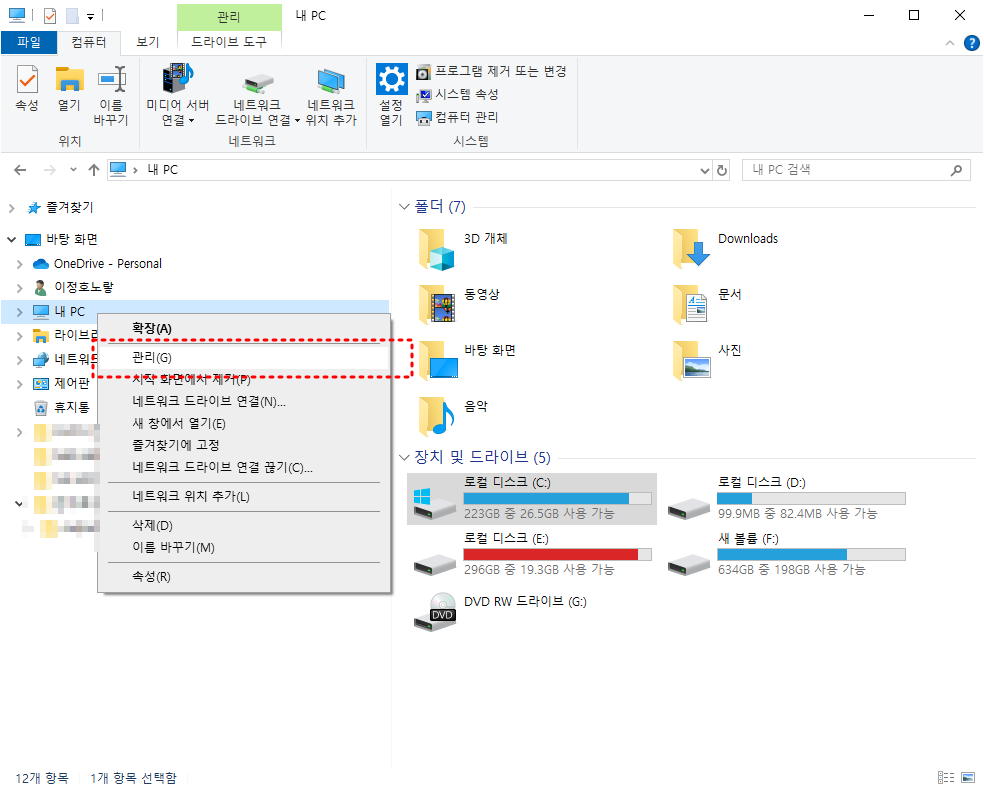 내 PC 실행 후 아이콘 우클릭 후 관리를 선택합니다.