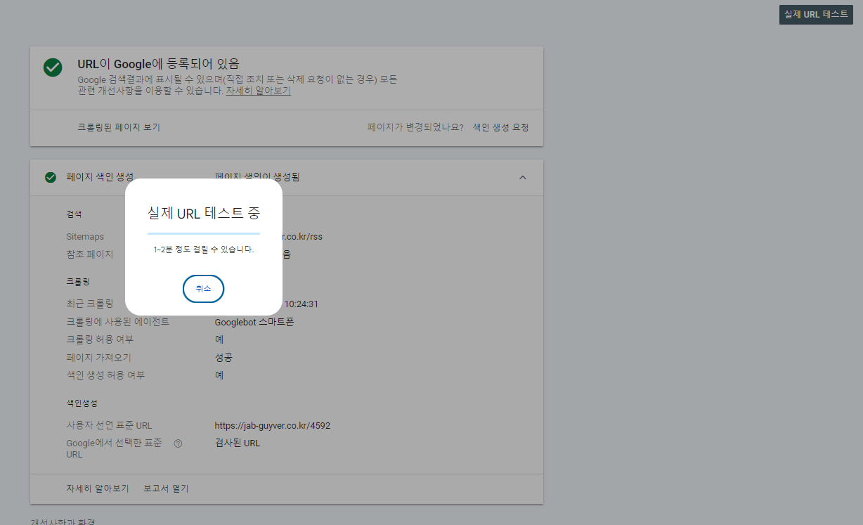 - 문제가 있다면, 색인 생성 요청을 클릭하여 URL 등록을 요청합니다.