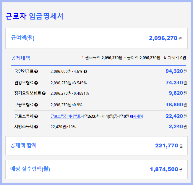 예를 들어, 월 급여 2,096,270원을 기준으로 국민연금은 약 94,332원, 건강보험은 약 74,313원, 장기요양보험은 약 9,116원, 고용보험은 약 18,866원이 공제됩니다.
