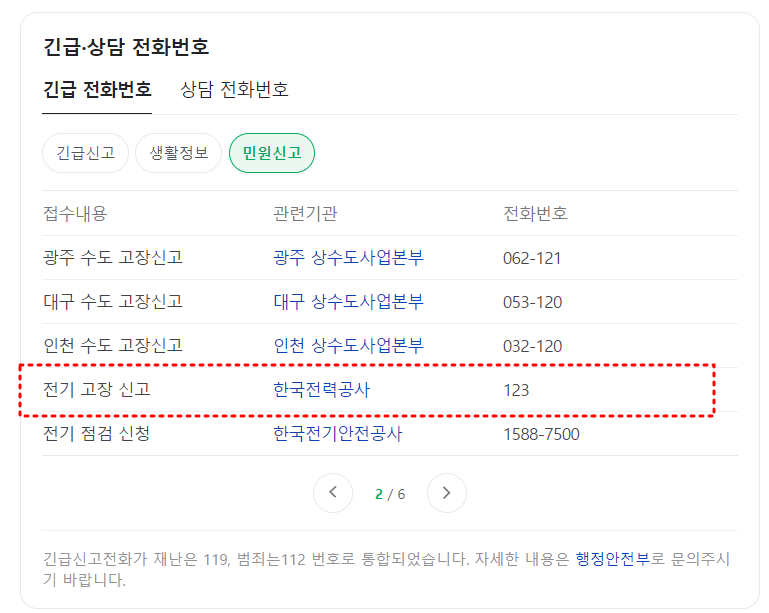 정전 신고는 한국전력공사(한전) 고객센터 123으로 가능합니다. (국번 없이 123)