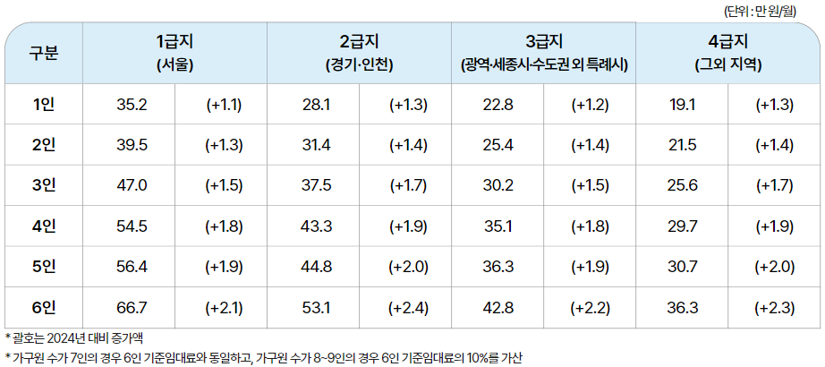 | 주거급여 (중위 48%) | ’24년 | 106만9,654 | 176만7,652 | 226만3,035 | 275만358 | 321만3,953 | 365만6,817 |