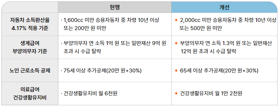 이는 현재 1,600cc 미만, 차량가액 200만 원 미만에서 완화된 기준입니다. 또한, 차량가액의 소득환산율도 일반재산 환산율(4.17%)을 적용하게 되어, 차량 소유로 인한 생계급여 탈락 사례가 줄어들 것입니다.