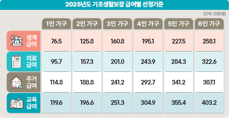 4인 가구 기준 생계급여는 2024년 183만 3,572원에서 2025년 195만 1,287원으로 인상됩니다.