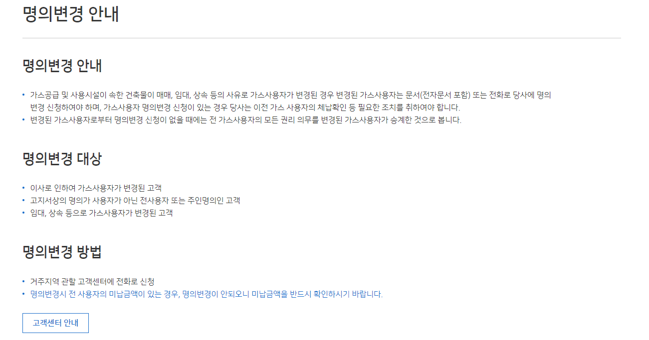 - 주의 사항: 이전 사용자의 미납금액이 있는 경우, 명의 변경이 불가능하므로, 이 점을 사전에 확인해야 합니다.