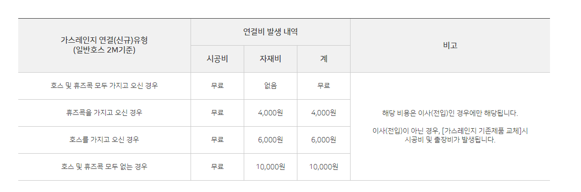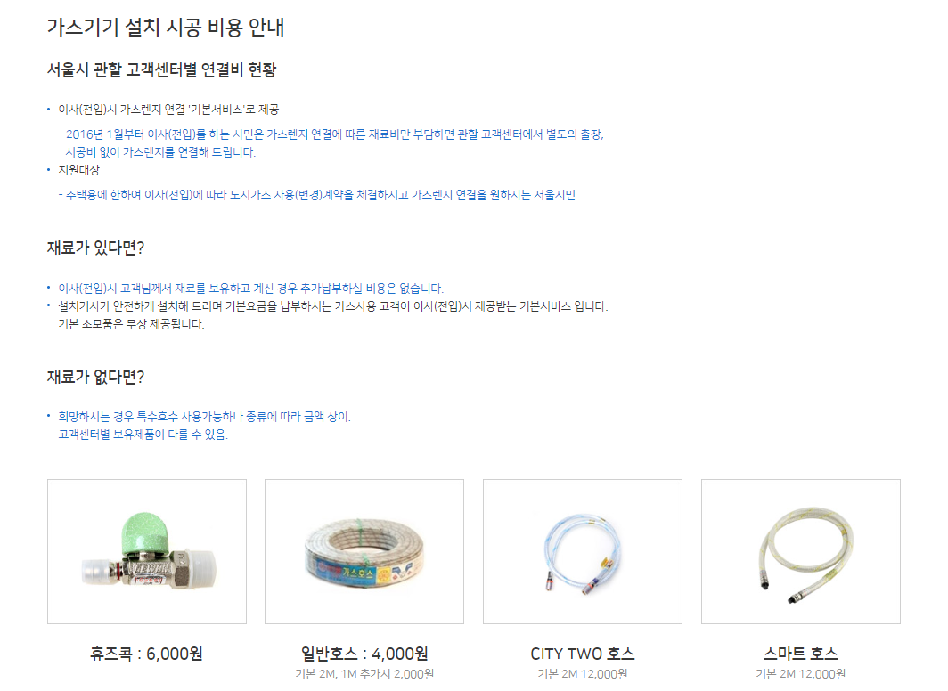 - 서울: 시공비는 무료지만 자재비는 별도입니다. 자재비는 도시가스 회사의 홈페이지에서 확인할 수 있습니다.