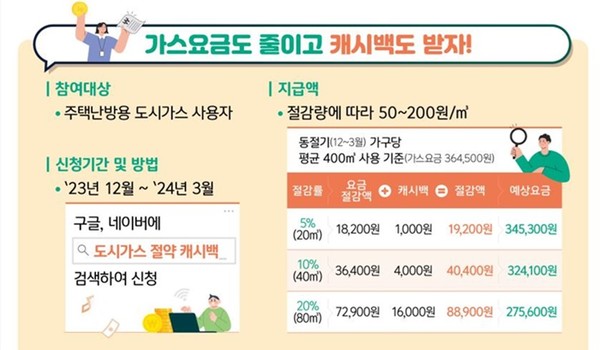 도시가스 캐시백 프로그램을 통해 절감한 가스비를 환급받을 수 있습니다. 전년도 난방비보다 3% 이상 절감했다면 현금으로 캐시백을 받을 수 있으니, 적극적으로 활용하시기 바랍니다.