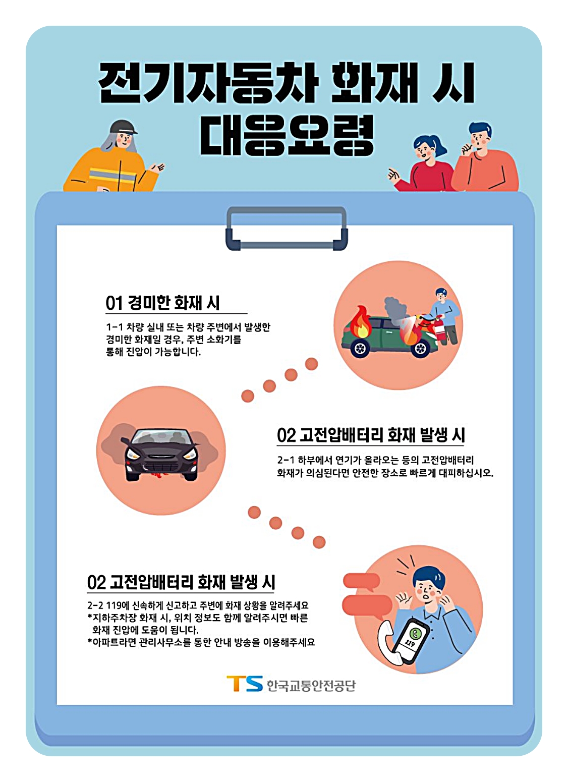 또한 고전압 배터리가 아닌 차량 내부나 주변에서 경미한 화재가 발생한 경우에는 주변 소화기를 이용해 진압할 수 있습니다.