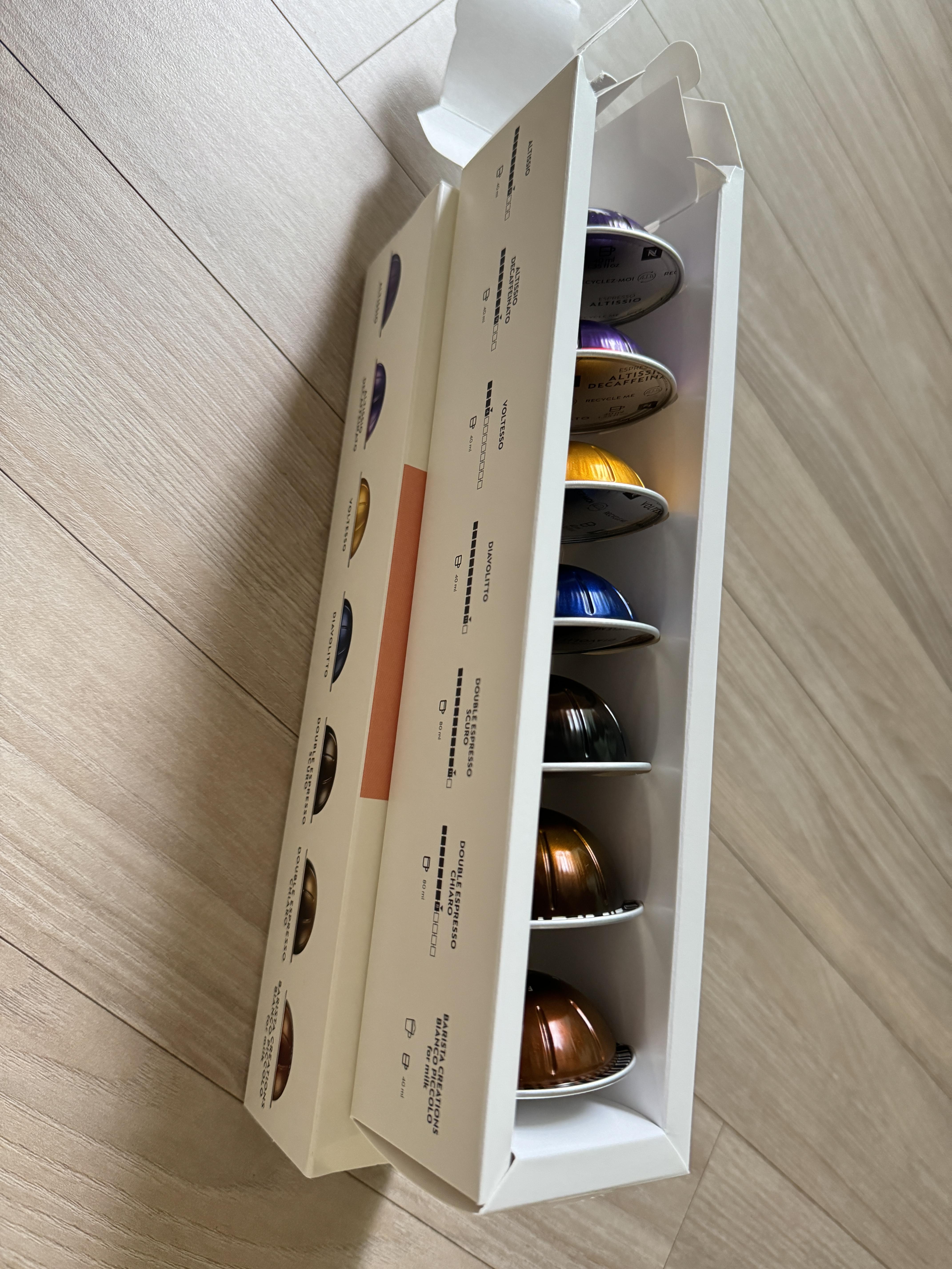 상자를 열면 7가지 다양한 커피 캡슐이 깔끔하게 정리되어 있었고, 각 커피에 대한 설명이 적힌 카드도 함께 들어 있었습니다.