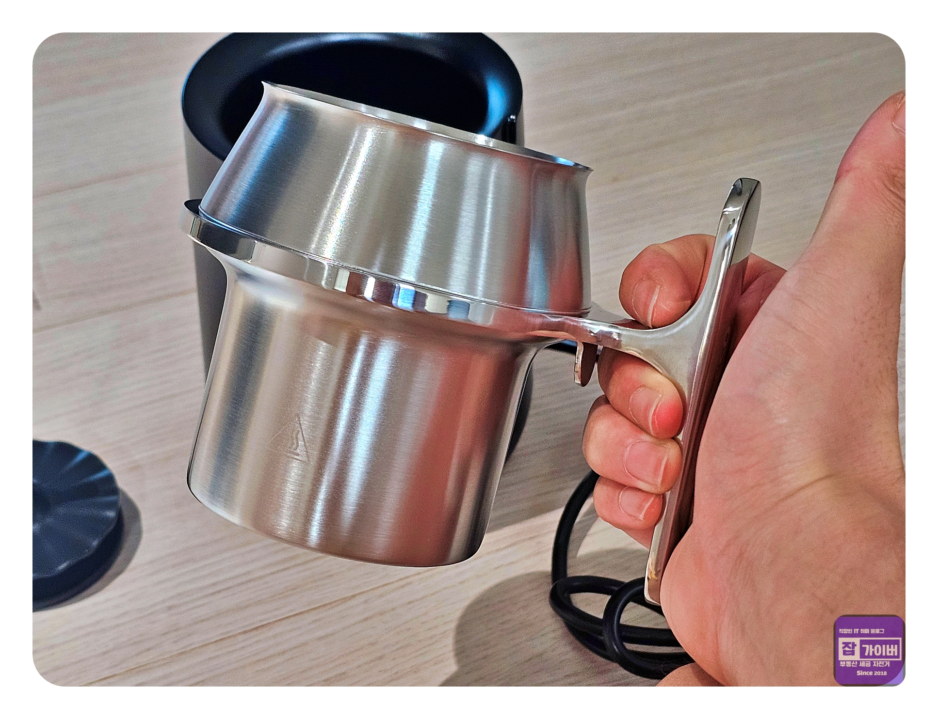 저그는 스테인리스 소재로 세척이 매우 용이한 장점이 있습니다. 외관은 고급스럽고, 손잡이 부분이 특히 인상적입니다.