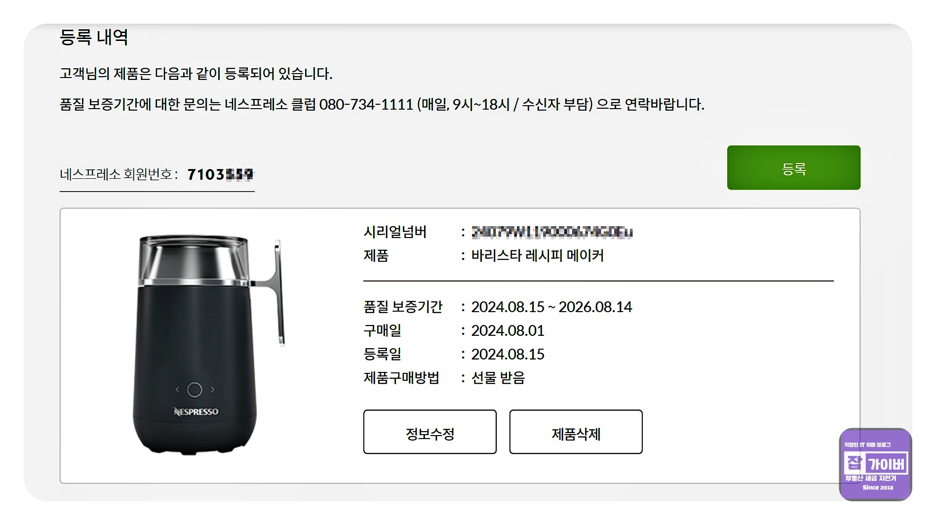 시리얼 넘버는 제품에 동봉된 종이에 있으며, 이를 네스프레소 앱을 통해 간단히 등록할 수 있습니다.