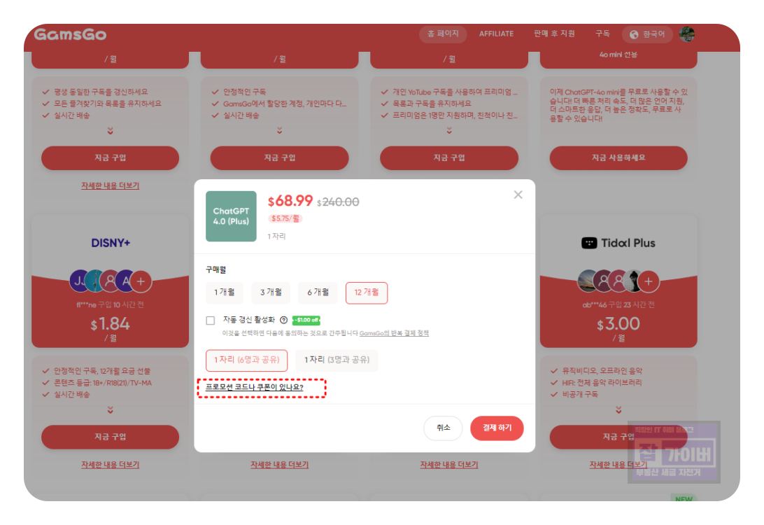 우선 겜스고 공식 홈페이지에 가입한 후, 원하는 서비스를 선택하고, 구독 기간을 설정한 다음 추천인 코드 HH8JQ를 입력하여 추가 할인을 받으면 됩니다.