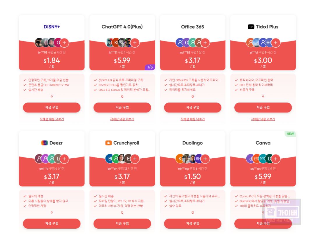 이 서비스를 통해 ChatGPT 외에도 YouTube, Netflix, Disney+, Spotify 등 인기 있는 여러 플랫폼을 원래 가격의 절반 이하로 구독할 수 있으며 저렴하게 구입할 수 있는 이유는 가족공유로 묶여 보다 저렴한 서비스 가능합니다.