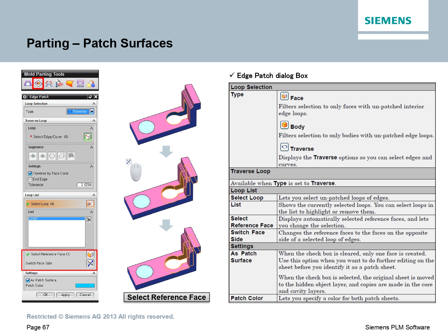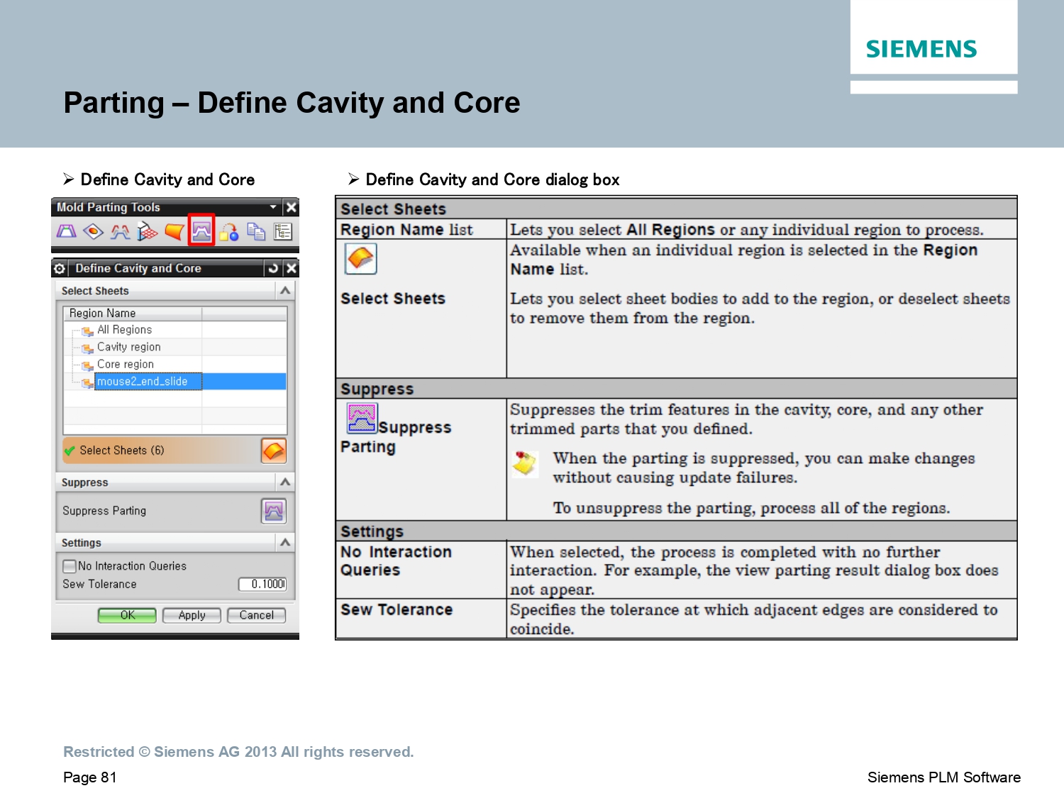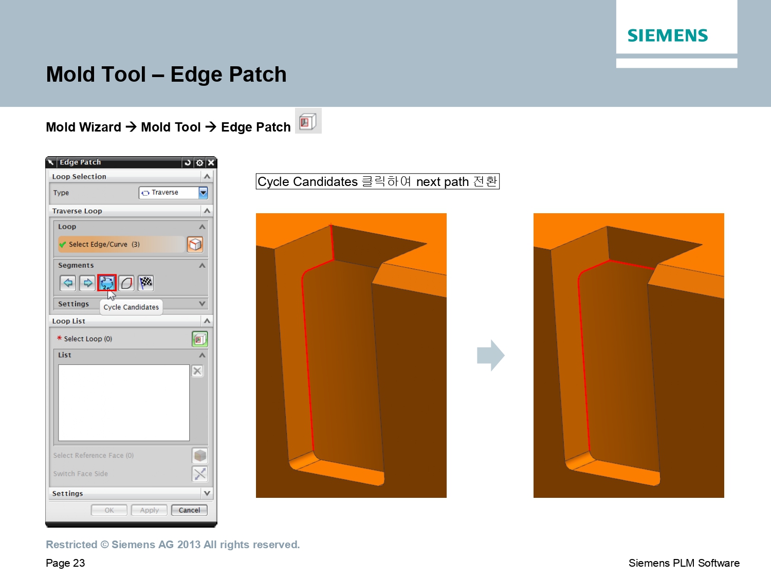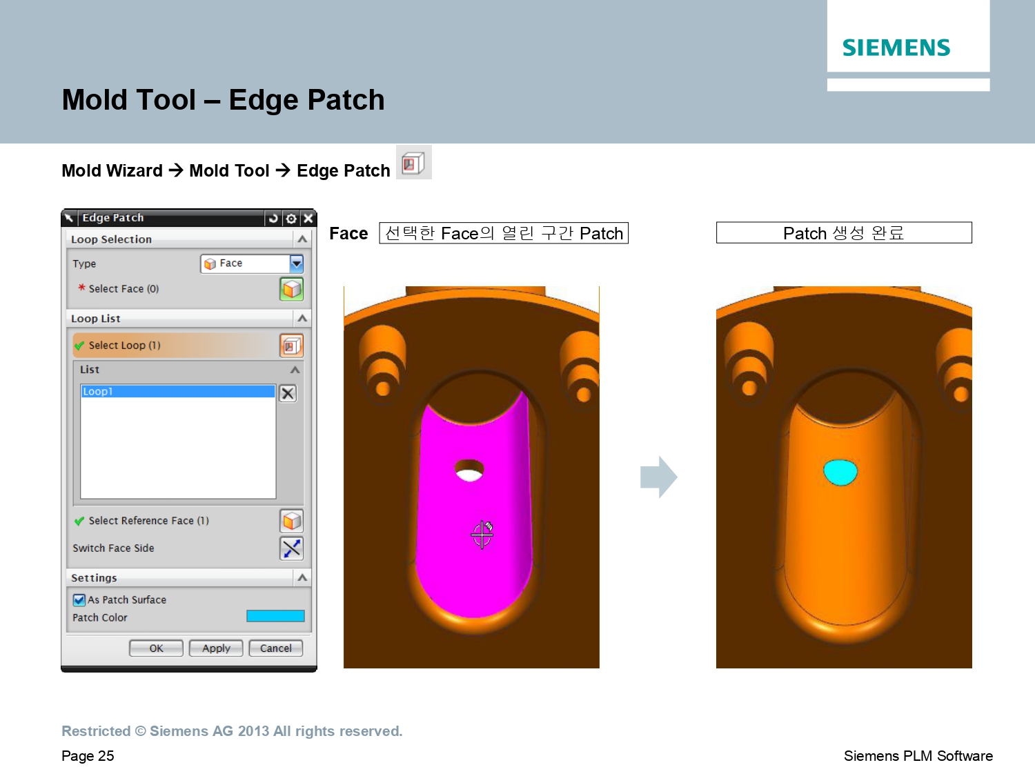 - 파팅 라인이 제대로 설정되지 않았을 경우, 자동 생성된 코어와 캐비티에 문제가 발생할 수 있습니다. 이 경우, 파팅 라인을 수동으로 수정하여 다시 시도합니다.