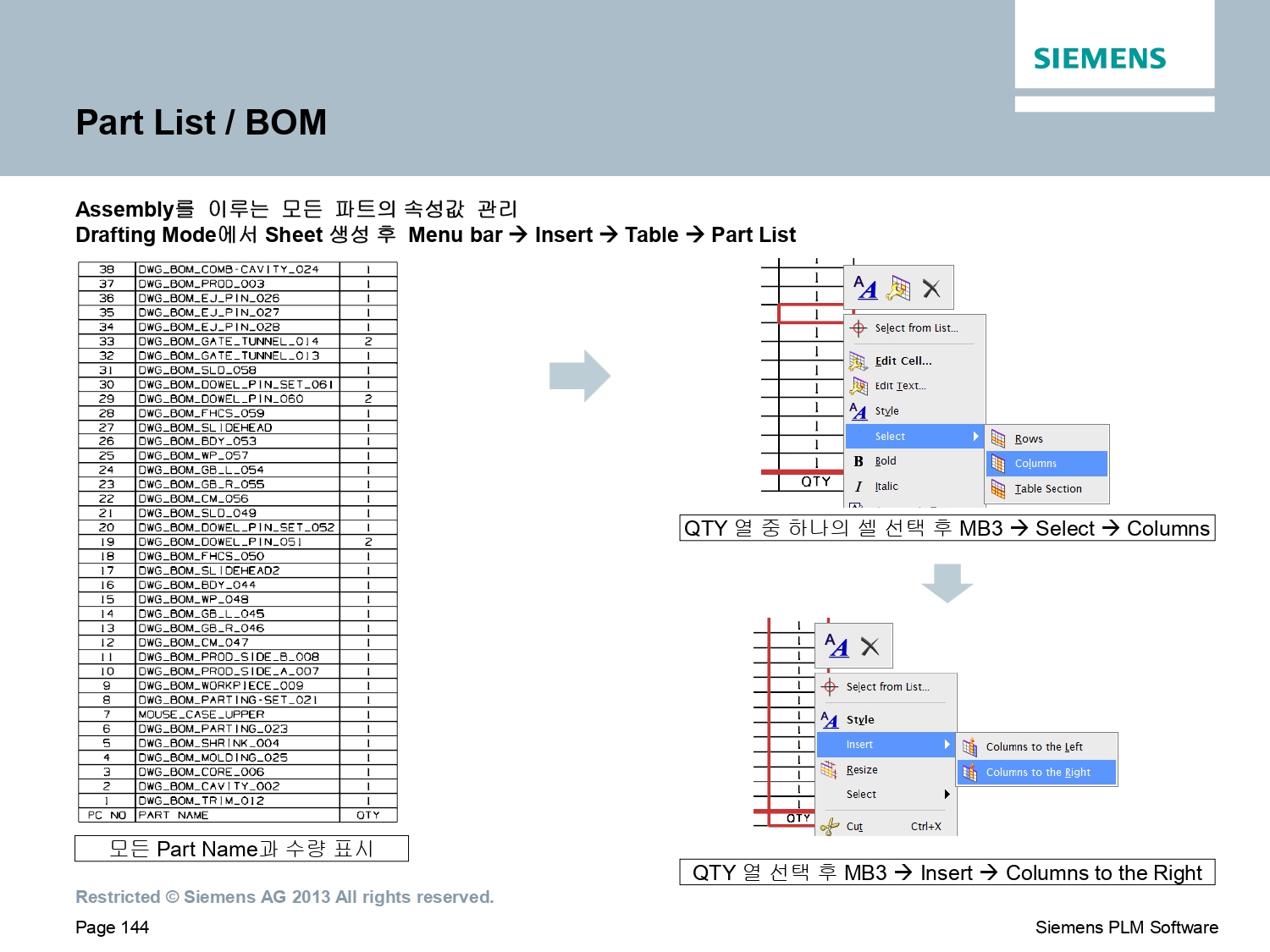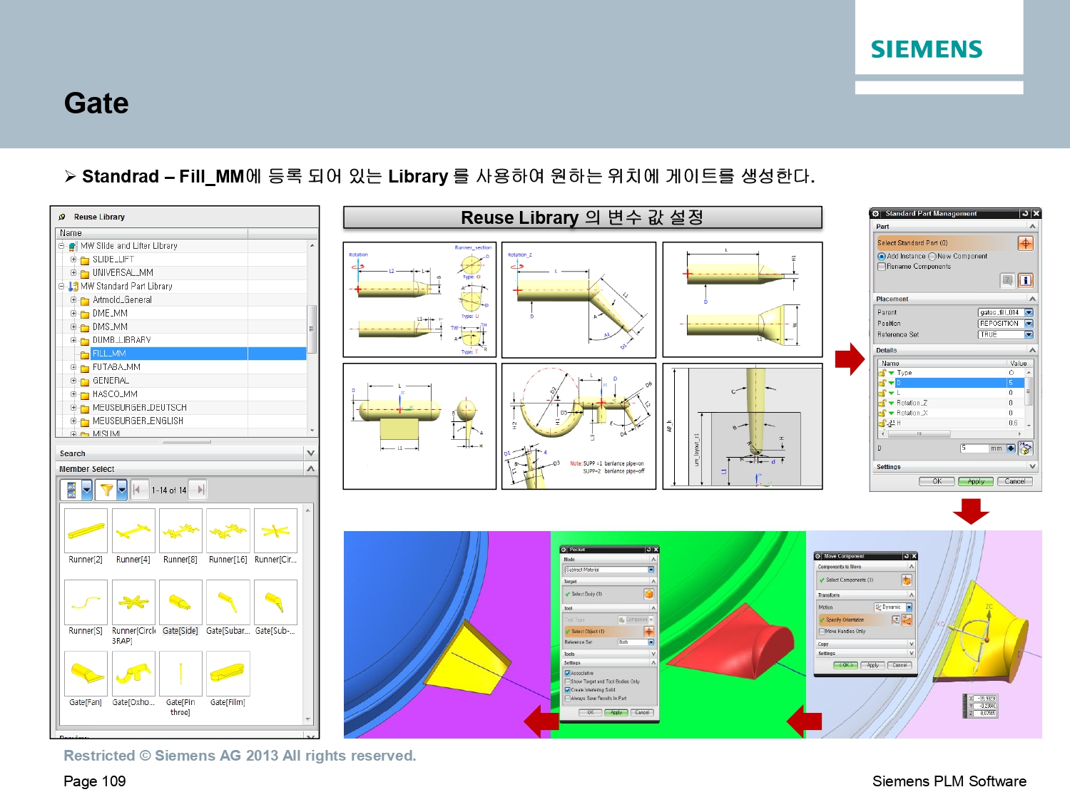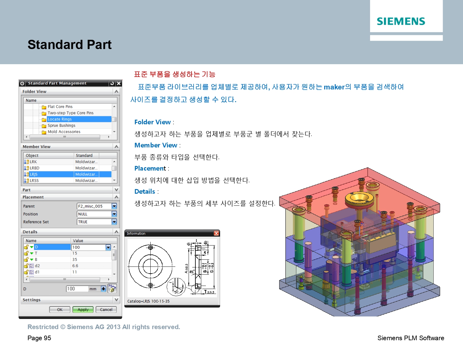 몰드 위자드는 금형 설계에 필요한 복잡한 작업을 자동화하여 설계 시간이 크게 단축됩니다. 예를 들어, 금형의 코어와 캐비티를 자동으로 생성하고, 파팅 라인과 파팅 면의 정의를 쉽게 할 수 있습니다. - 부품 라이브러리