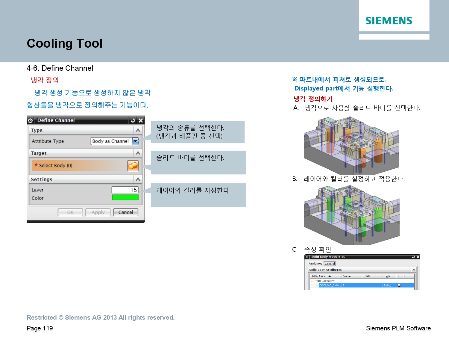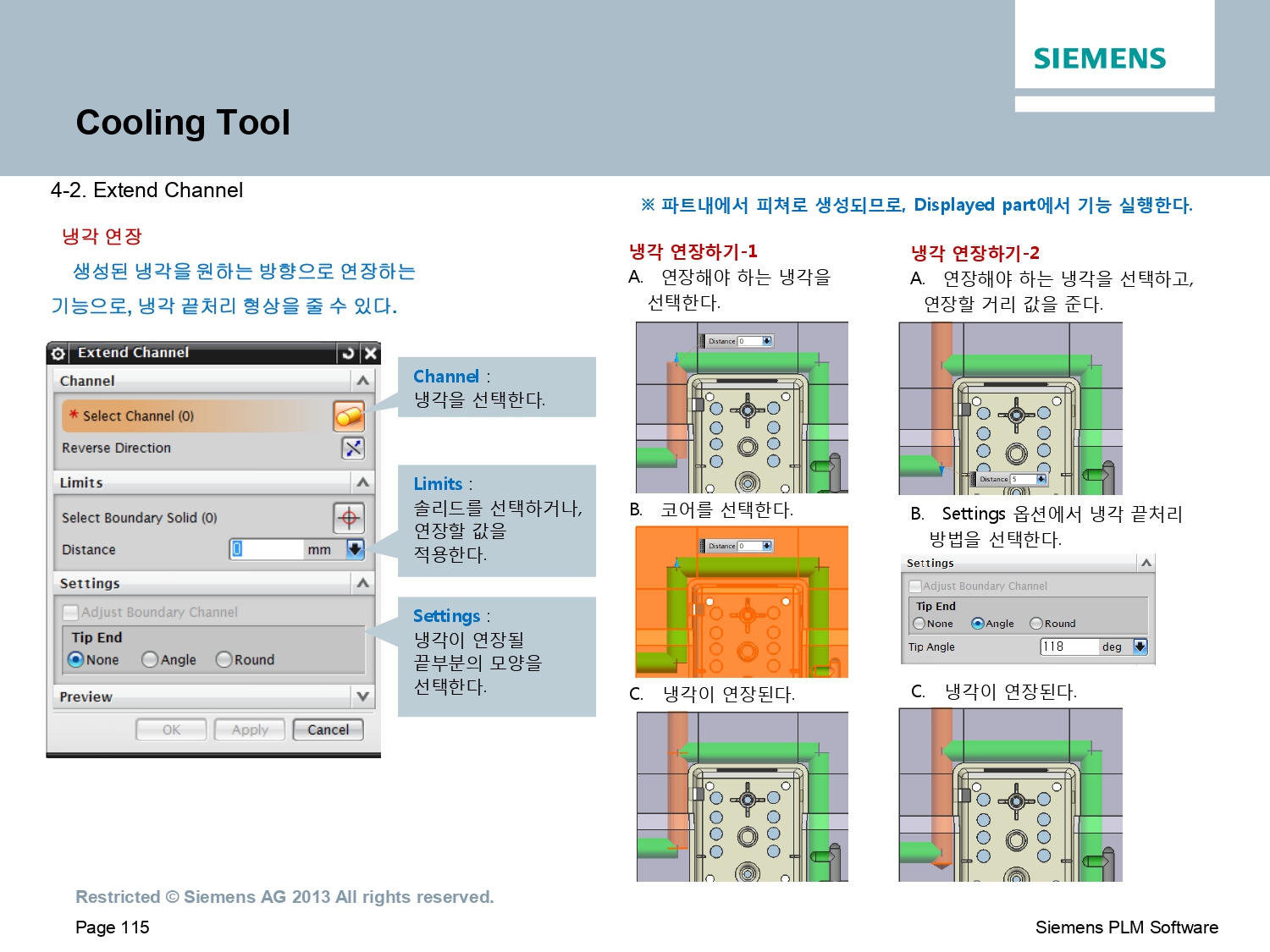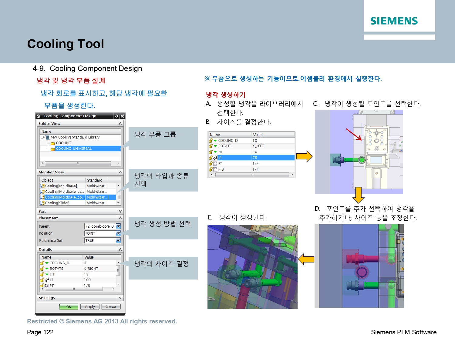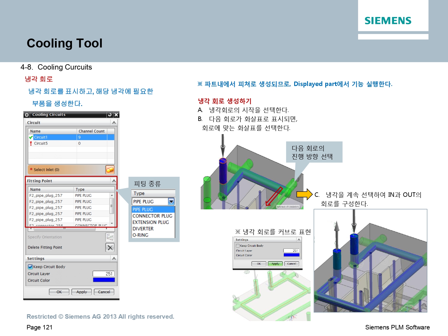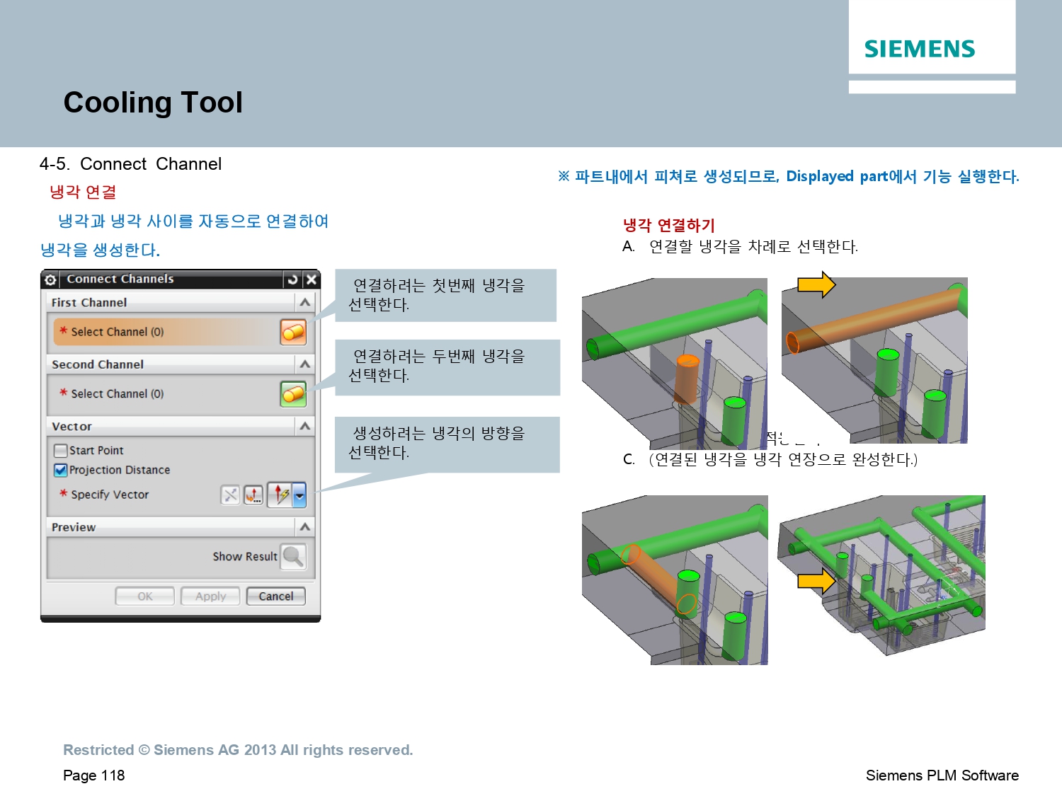 - 냉각 채널 생성: 몰드 위자드는 자동으로 냉각 채널을 설계할 수 있는 도구를 제공합니다. 냉각 채널의 경로를 설정하고, 몰드의 각 부위에 필요한 냉각 효율을 극대화합니다.