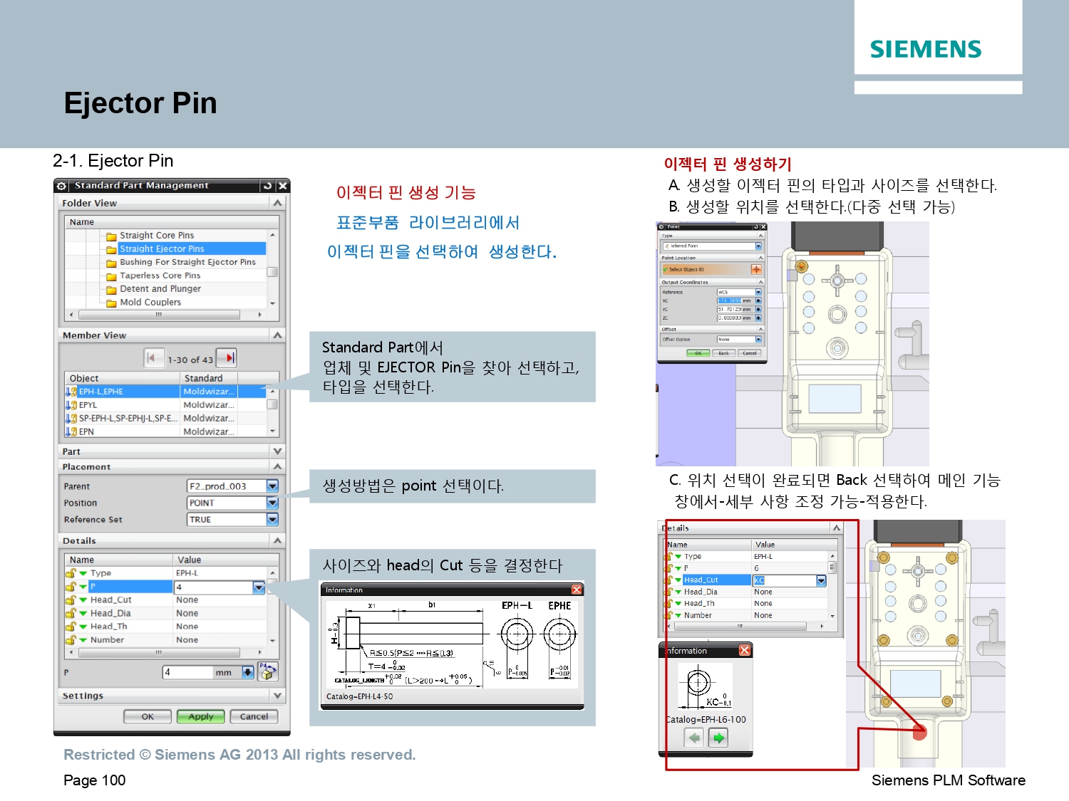 - 표준 부품 선택: 몰드 위자드는 다양한 표준 부품 라이브러리를 제공합니다. 이 라이브러리에서 금형 설계에 필요한 부품(예: 가이드 핀, 이젝터 핀 등)을 선택할 수 있습니다.