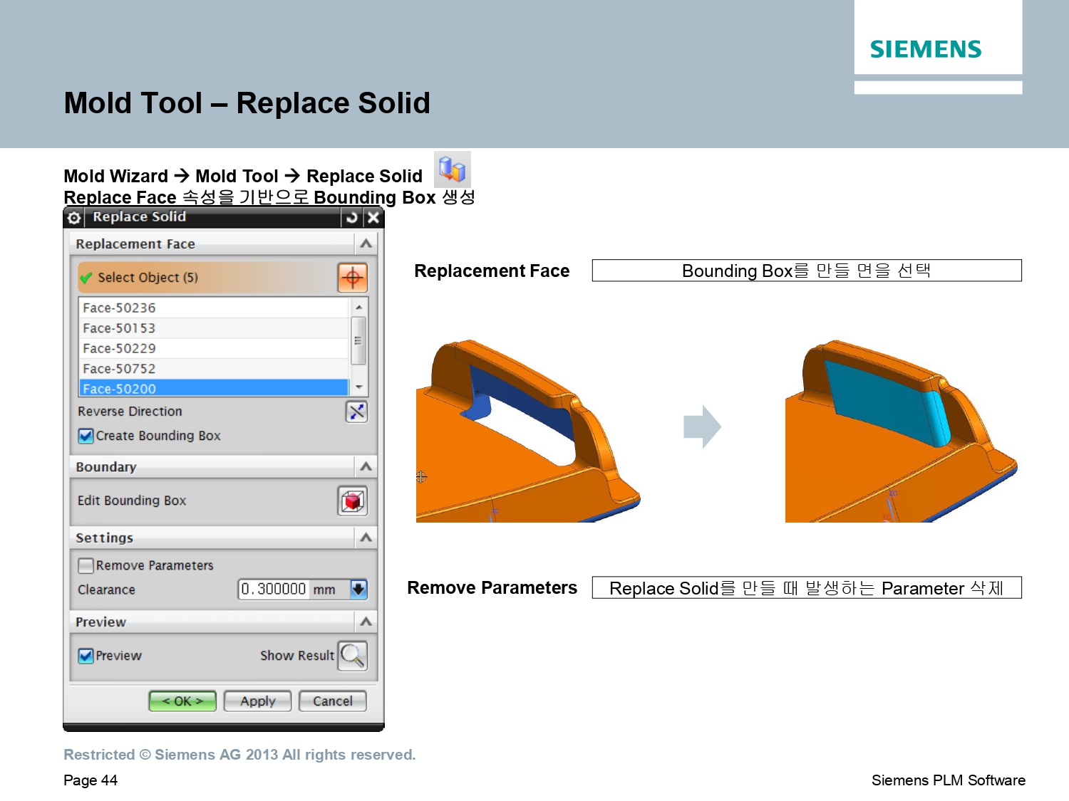 - 코어 및 캐비티 생성: 파팅 라인과 파팅 면이 설정되면, 코어와 캐비티 블록을 자동으로 생성합니다. 몰드 위자드는 이 과정을 자동화하여 시간을 절약하고 정확성을 높입니다.