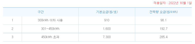 - 3단계: 451kWh 이상 (기본요금 7,300원, kWh당 307.3원)