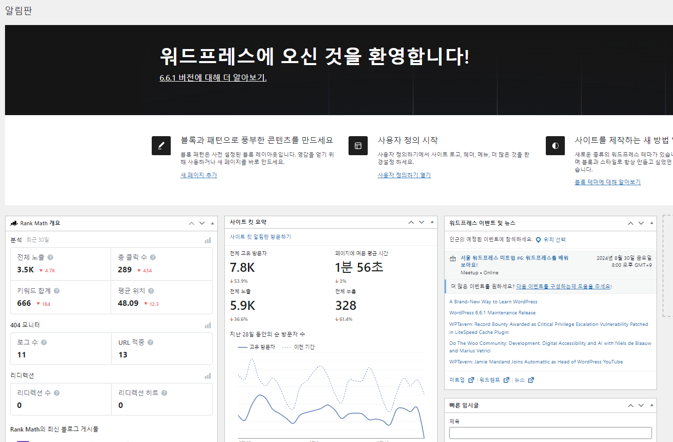 워드프레스 관리자 페이지의 대시보드는 다양한 위젯으로 구성됩니다. 불필요한 위젯이 많을 경우 로딩 시간이 길어질 수 있습니다.