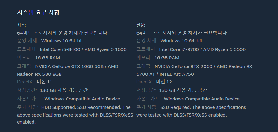 추가 사항 HDD 지원, SSD 권장. DLSS/FSR/XeSS 활성화 상태에서 테스트됨. SSD 필수. DLSS/FSR/XeSS 활성화 상태에서 테스트됨.