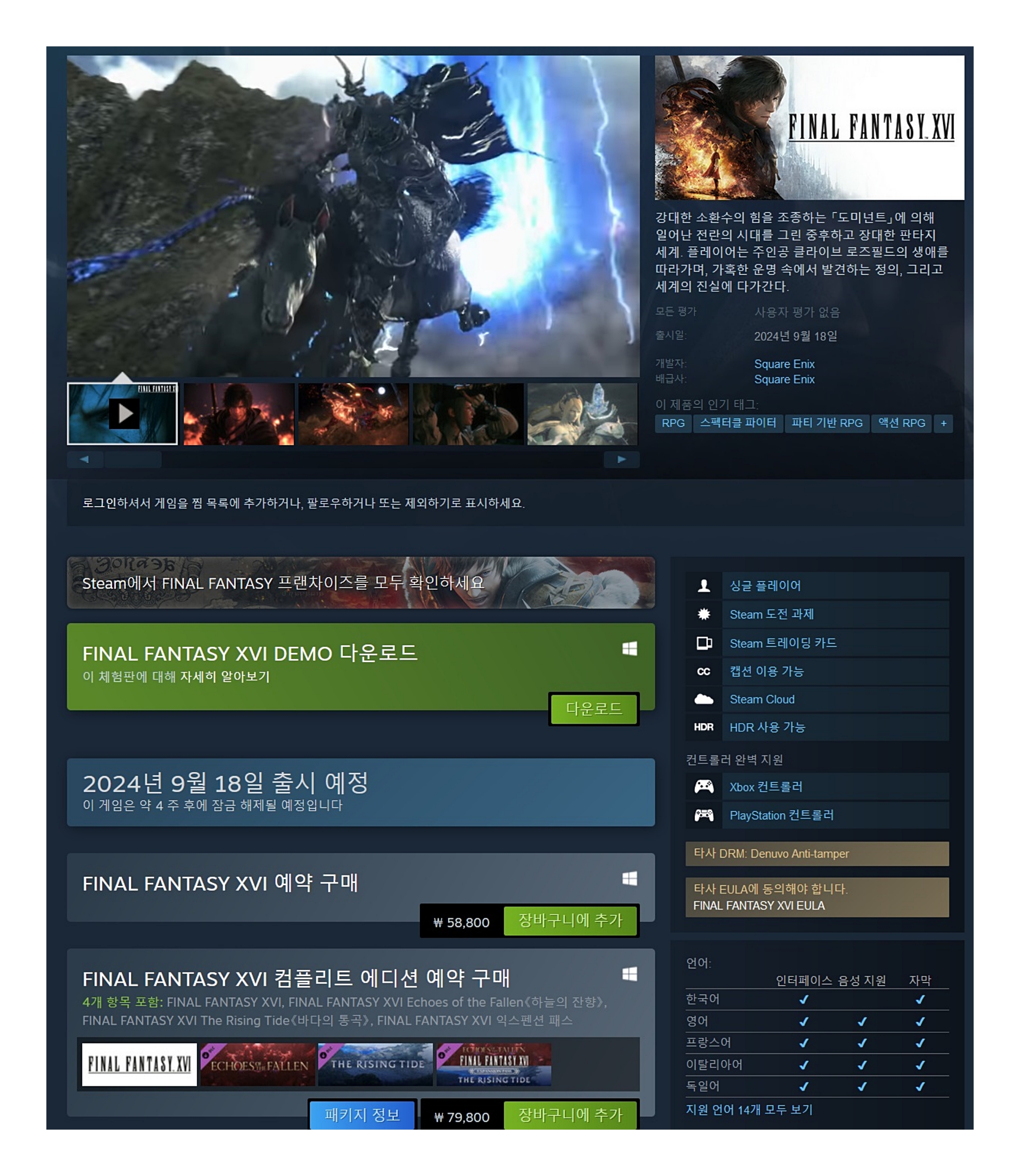 어둡고 진지한 스토리로 많은 찬사를 받았던 '파이널 판타지 16(Final Fantasy 16)'이 드디어 PC 플랫폼으로 돌아옵니다. 스퀘어 에닉스는 공식 유튜브 채널을 통해 2024년 9월 18일 PC 버전이 출시된다고 발표했으며, 스팀 및 에픽게임즈 스토어에서 체험판을 제공하면서 팬들의 기대감을 높였습니다.