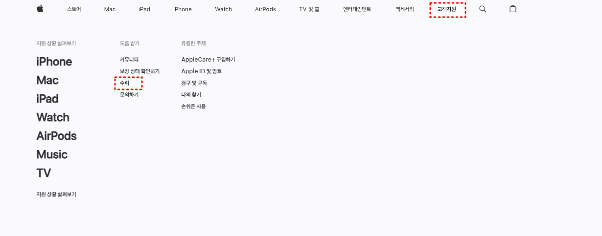 - 애플 공식 홈페이지 접속 후 고객지원 메뉴에서 'Apple 수리' 선택