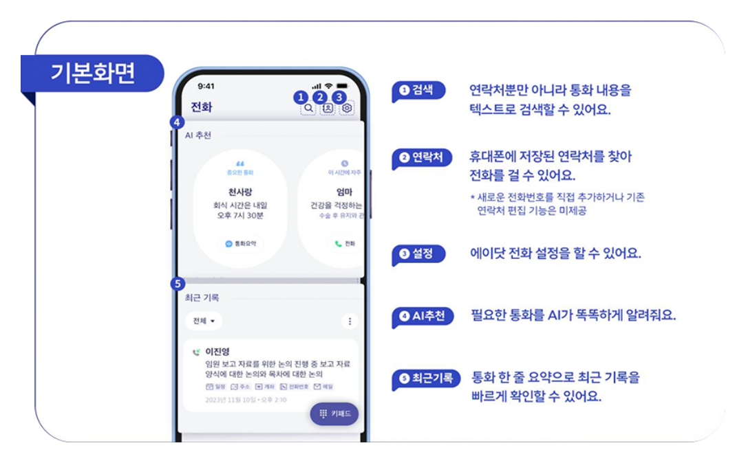 에이닷은 단순히 통화를 녹음하는 것에 그치지 않고, 녹음된 내용을 텍스트로 변환해 요약해주는 고급 기능을 제공하여 통화 내용을 더욱 효과적으로 관리할 수 있습니다.