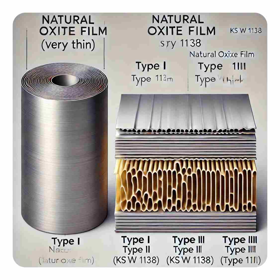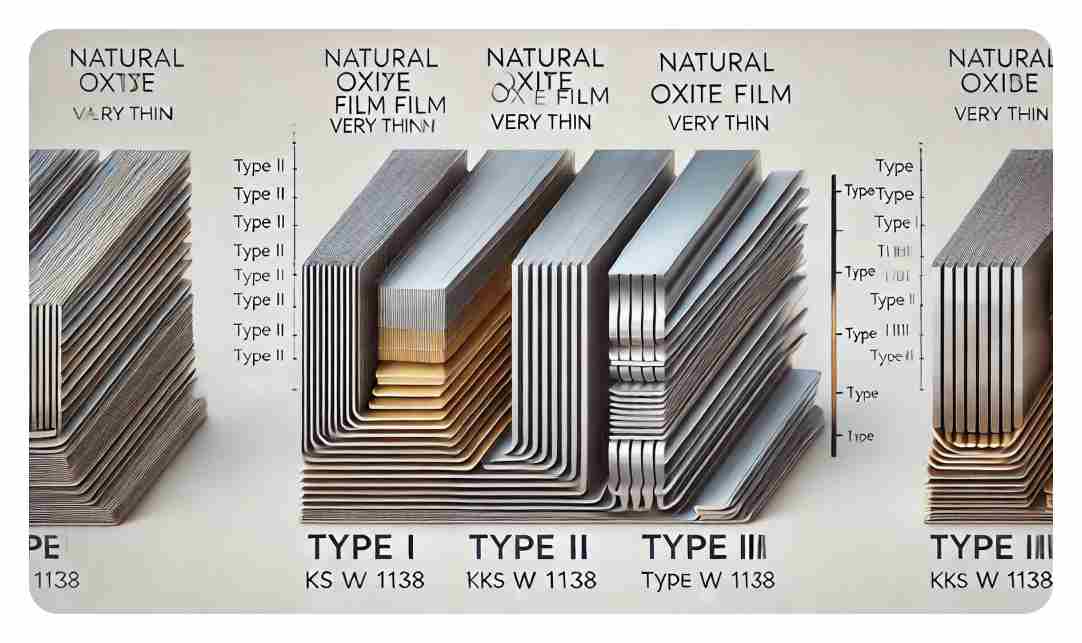 한국 산업 표준(KS)에서는 알루미늄 아노다이징에 대한 규격을 KS W 1138로 정의하고 있으며 이 규격은 피막의 유형과 두께, 표면 처리 방법에 따라 I형, II형, III형으로 분류됩니다.