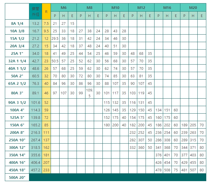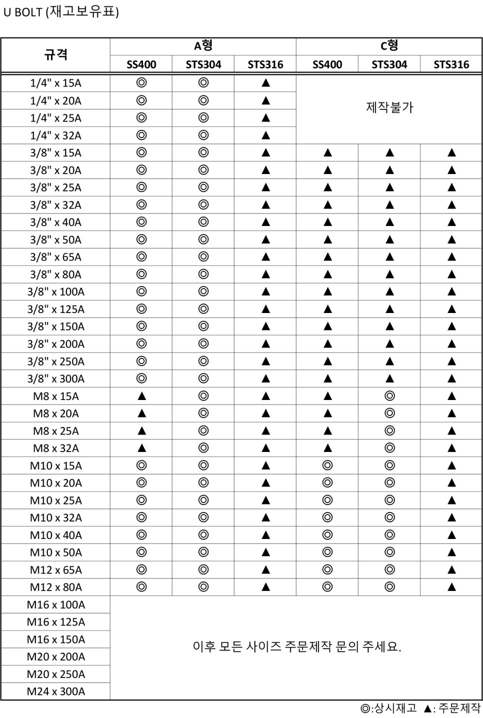 U-Bolt 종류 나사부 직경 (mm) 적용 파이프  호칭 파이프 외경 (mm) U-Bolt 내경 (mm) 비고