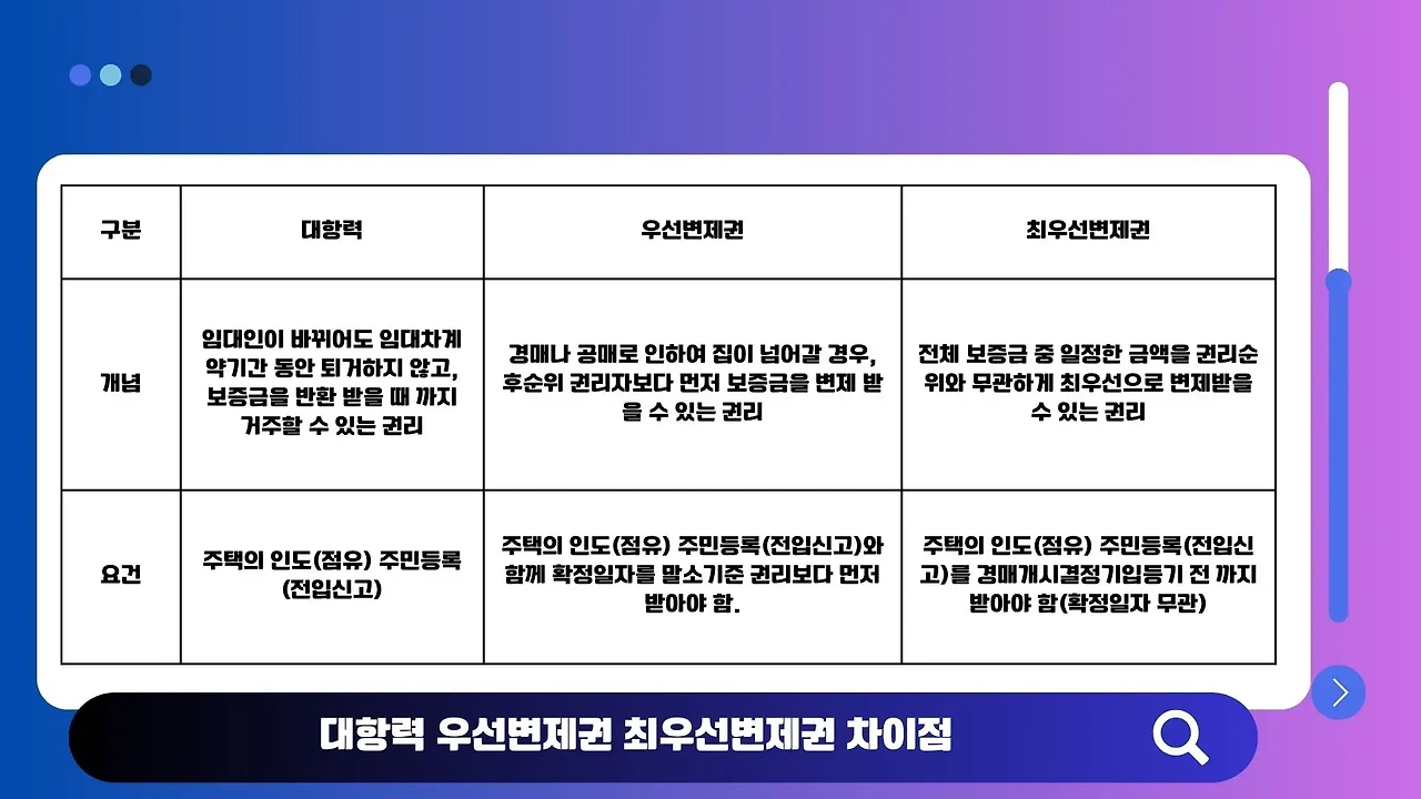 - 우선변제권: 임차인이 주택에 거주하며 일정한 보증금을 지불한 경우, 임대차 계약이 종료될 때 임차인은 해당 보증금을 다른 채권자보다 우선적으로 돌려받을 수 있는 권리를 가집니다. 이는 주택이 경매로 넘어가는 등의 상황에서 임차인의 보증금을 보호하기 위한 장치입니다.