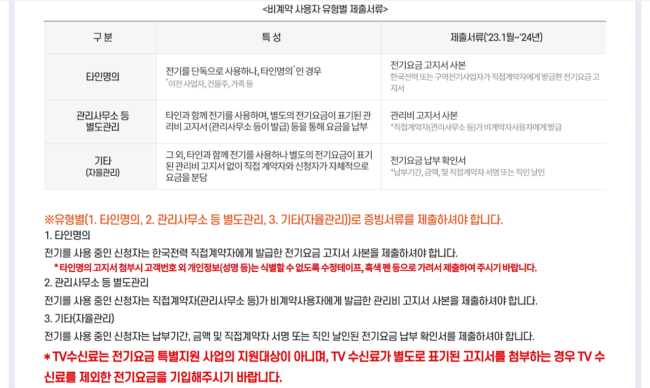 - 비계약 사용자: 관리비 등에 전기요금을 포함해 납부하는 소상공인은, 사업자 정보와 한국전력 고객번호 외에도 월 1만 2천원 이상의 전기요금 납부 영수증을 추가로 제출해야 합니다.