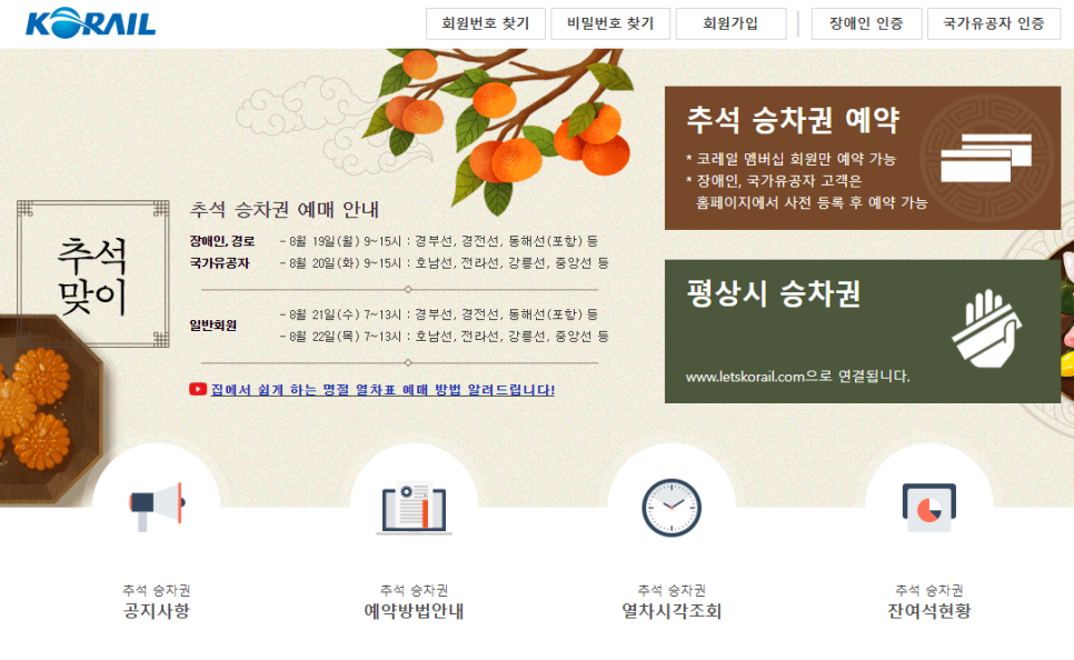 | KTX 경로/장애인 | 2024년 8월 19일 ~ 20일 (09:0015:00) | 경로, 장애인 | 전화, 온라인 |
