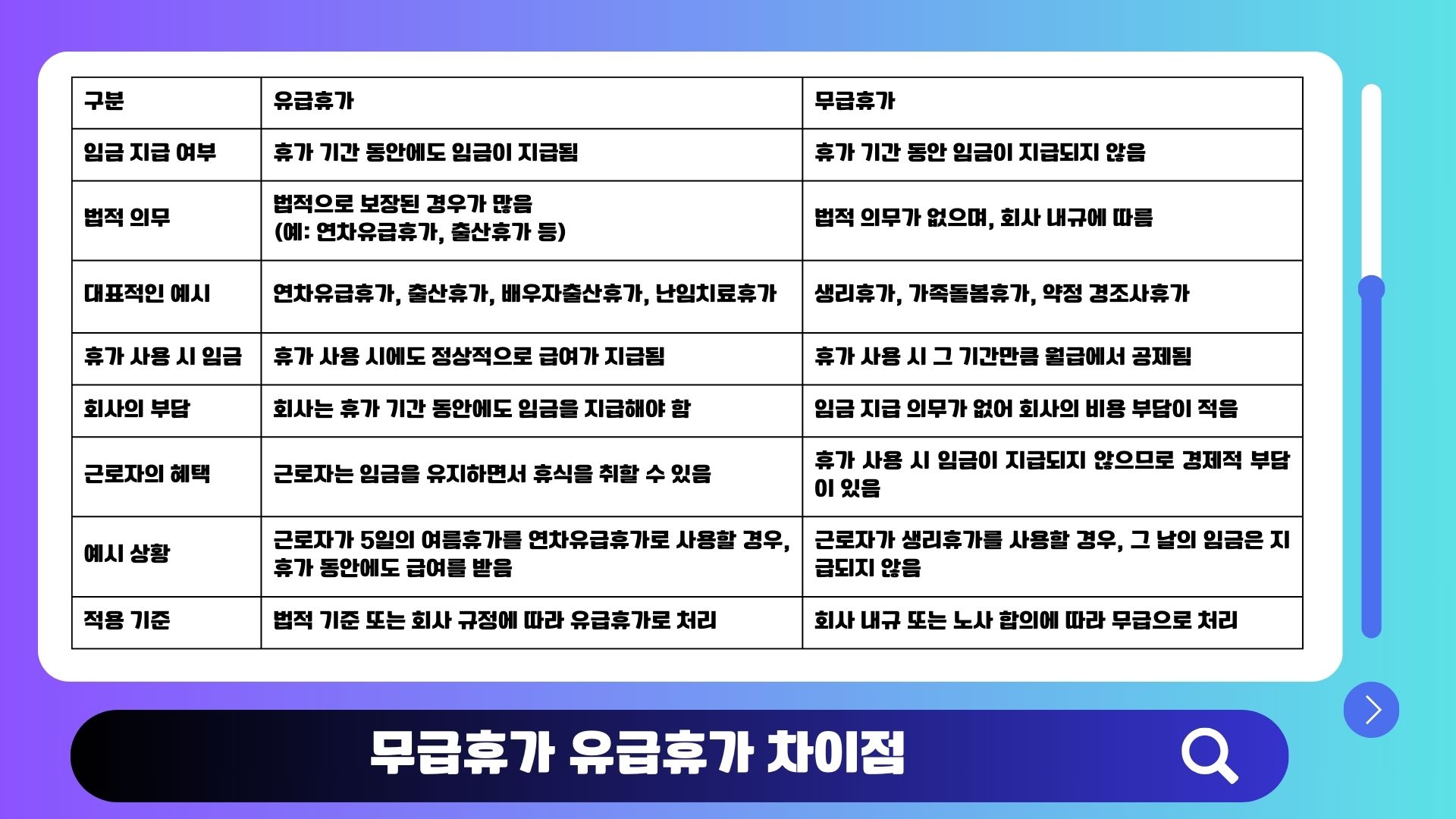 | 장점 | 소득이 유지되며, 근로자의 휴식 보장 | 회사에 비용 부담이 적고, 유연한 휴가 제공 가능 |
