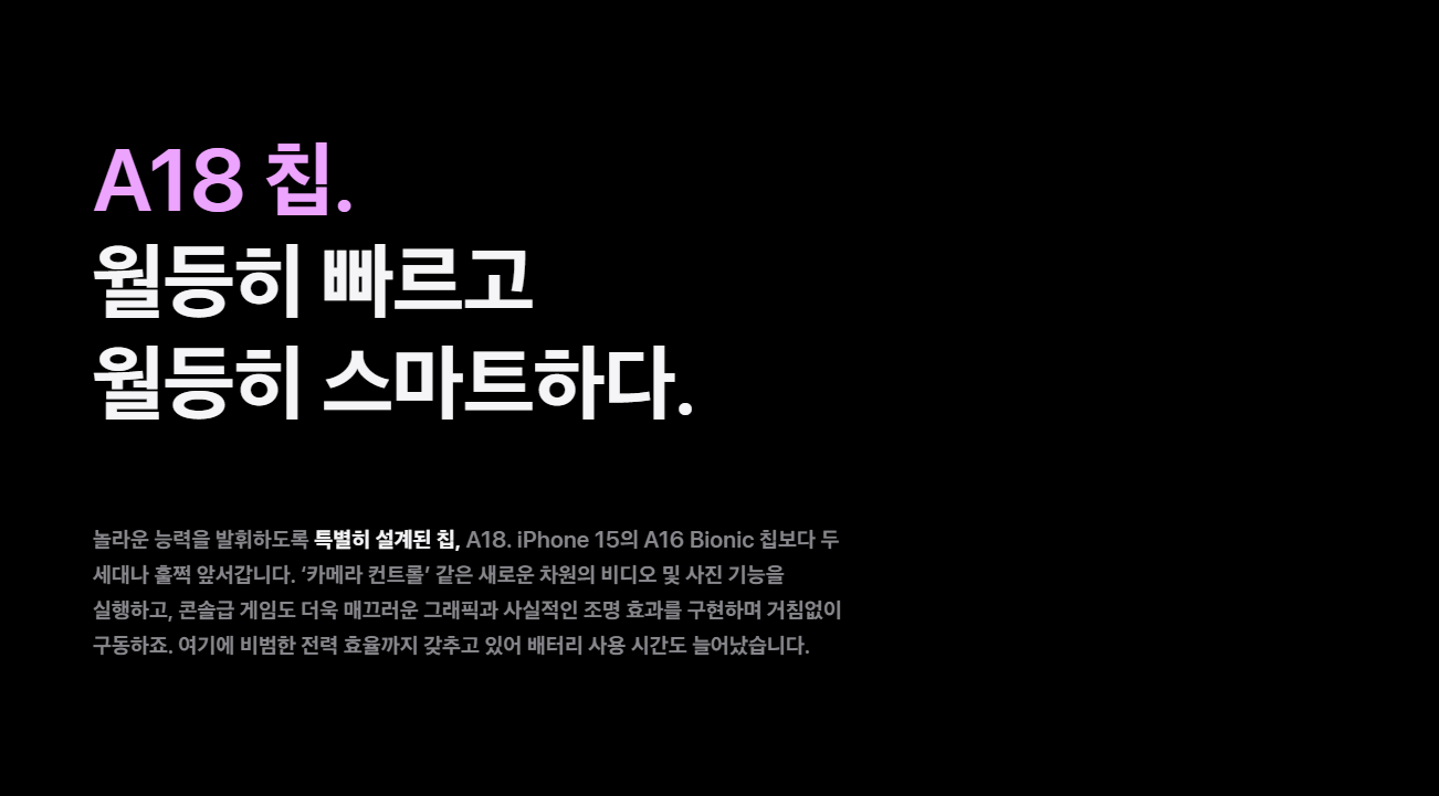 아이폰 16 시리즈는 2세대 3나노 공정으로 제작된 A18 Pro 칩을 탑재해, 성능과 효율성이 크게 향상되었습니다.