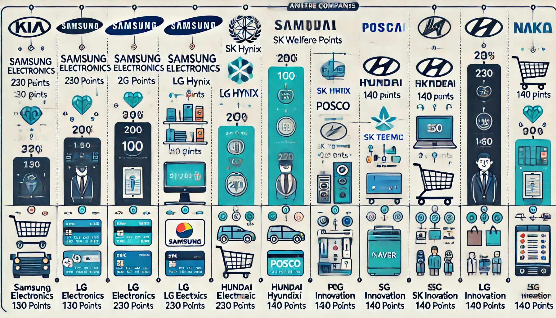 특히 삼성전자는 연간 100만 포인트를, SK하이닉스는 230만 포인트 상당을 지급하고 있습니다. 포인트는 회사에서 운영하는 복지 쇼핑몰뿐만 아니라, 오프라인에서 쇼핑, 식사, 여행 등에 다양하게 사용할 수 있어 직원들에게 실질적인 혜택을 제공합니다.