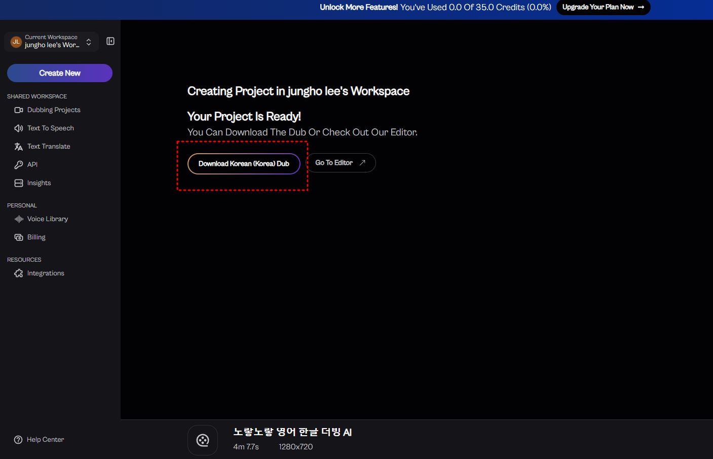 더빙 요청을 완료한 후, 결과물을 받기까지 걸리는 시간은 약 10분 정도 소요되었으며 무료 사용자도 충분히 빠른 속도로 더빙을 진행할 수 있지만, 유료 요금제를 이용하면 워터마크가 제거되고 더 많은 기능을 사용할 수 있다는 장점이 있습니다.