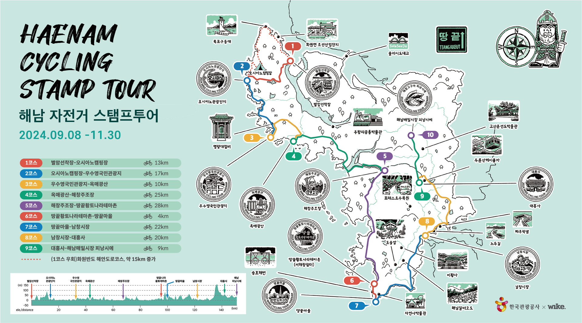 각 코스에서는 다양한 해남의 문화유산과 관광지를 지나게 되며, 고도 차이가 꽤 있어 도전적인 라이딩을 즐길 수 있습니다. 특히, 총 10개의 스탬프를 획득할 수 있으며, 이를 통해 완주 인증을 받을 수 있습니다.