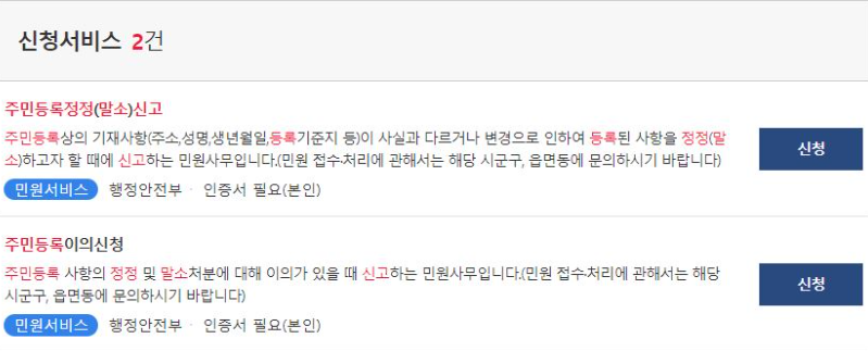 검색 결과에서 '신청'을 눌러 '주민등록정정(말소)신고' 메뉴로 이동합니다.