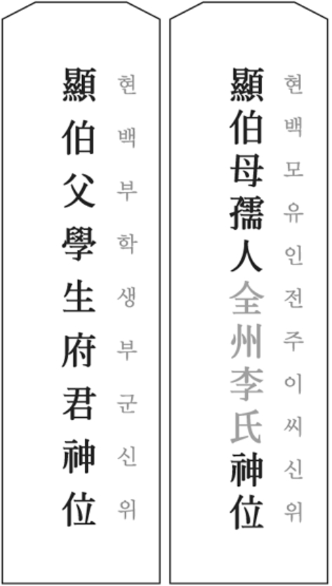 | 백모 | 顯伯妣孺人本貫姓氏神位 | 현백비유인경주김씨신위 (顯伯妣孺人慶州金氏神位) |