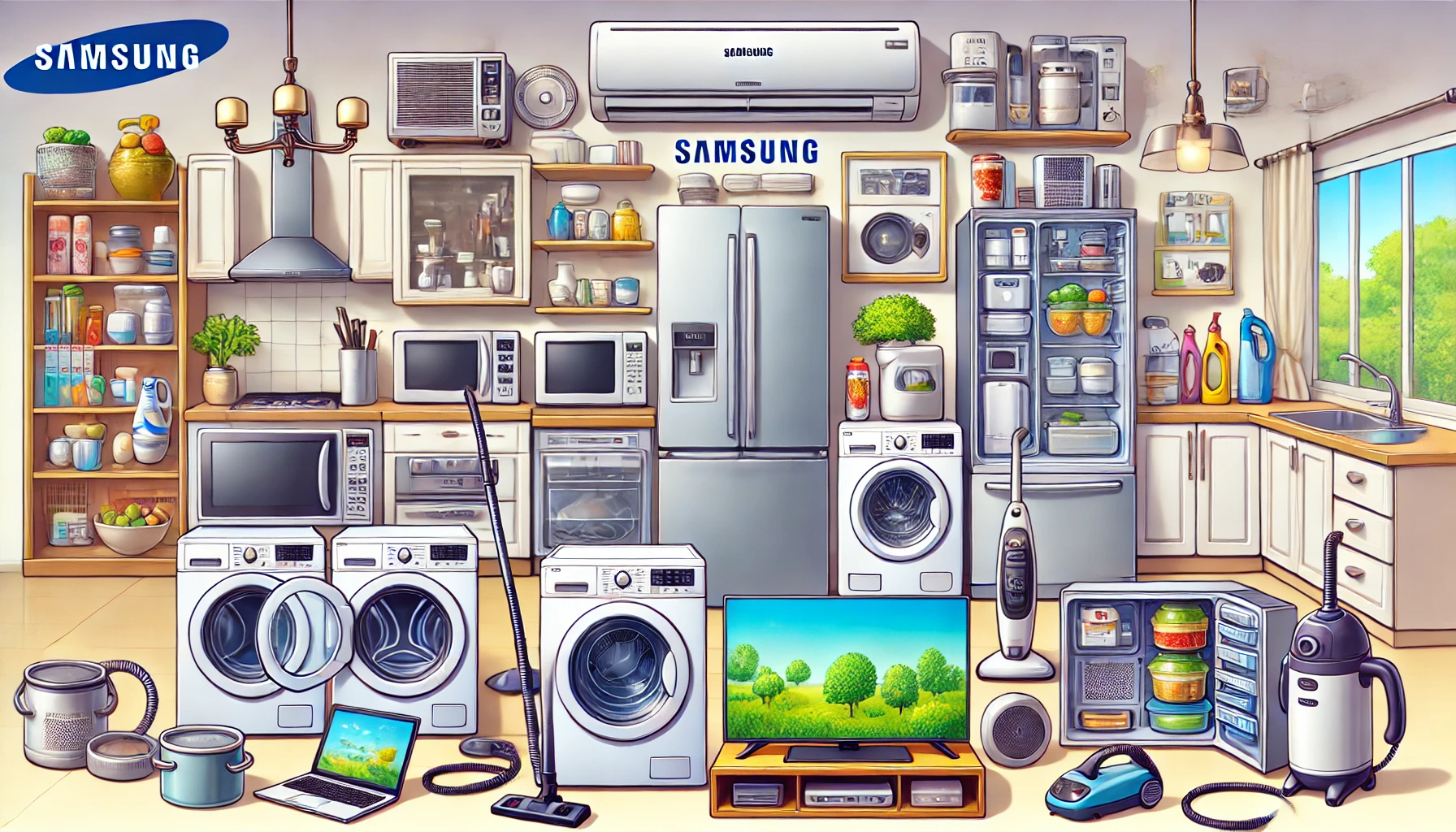 전자레인지는 빠른 조리와 편리한 기능을 제공하며, 에어컨은 강력한 냉방 성능과 공기청정 기능이 특징입니다. 청소기는 강력한 흡입력을 자랑하며 로봇 청소기 및 무선 청소기 형태로 제공됩니다.