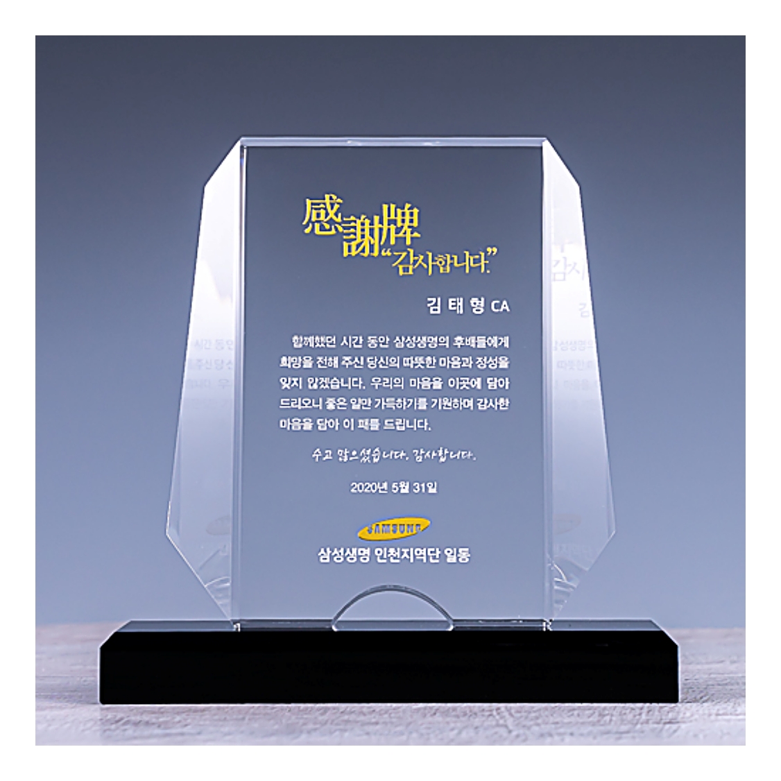 정년퇴직을 하는 상사나 오래 근무한 동료에게는 감사패가 감동적인 퇴사 선물이 될 수 있습니다.