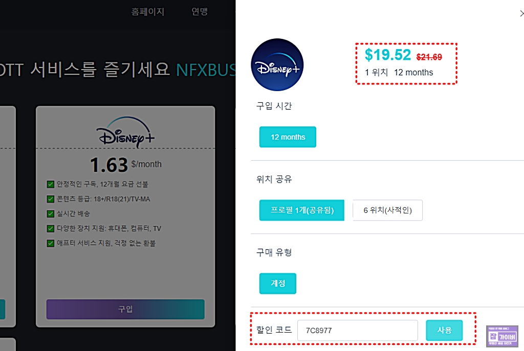 결제할 때는 추천인 코드 7C8977을 입력하면 추가 10% 할인을 받을 수 있고 저도 여기에 커미션을 받는 구조라 서로 윈윈할 수 있어서 저는 가족들이나 친구들에게도 추천해서 사용하고 있습니다.