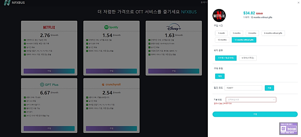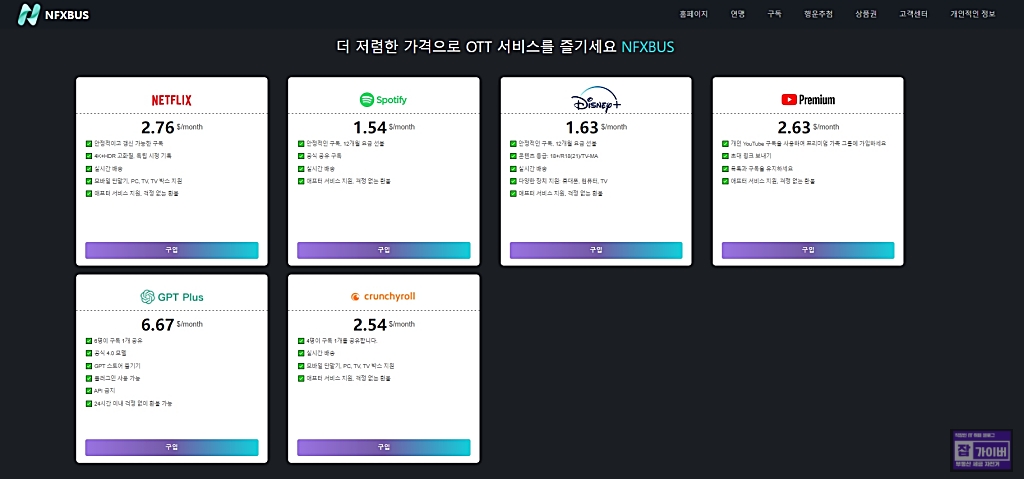 특히 NFXBUS공식 구독 방식을 통해 안정성을 보장해주며, 유튜브 프리미엄 가족공유도 가능합니다.