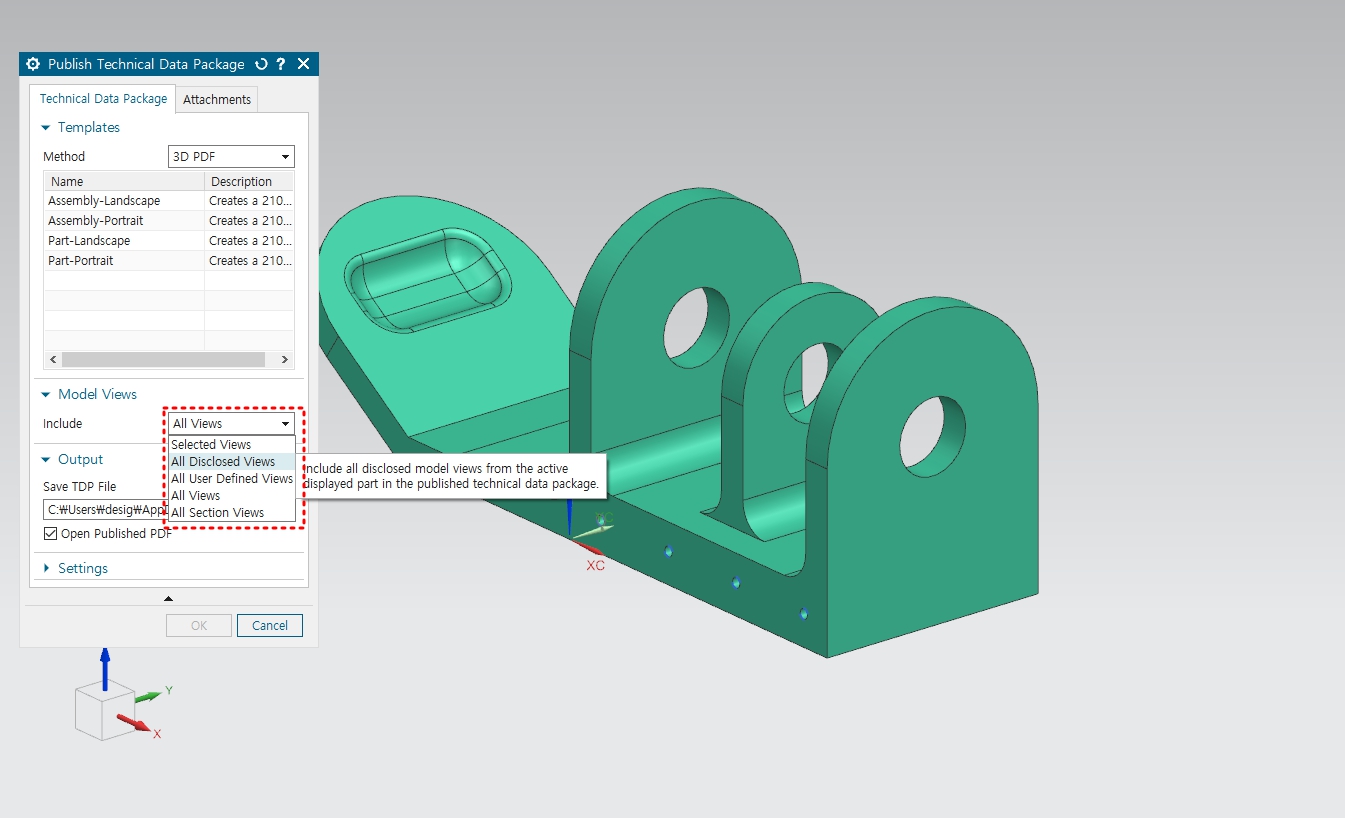 - 파일 형식에서 Publish Technical Data Package를 선택하고, 3D PDF로 저장 옵션을 선택합니다.