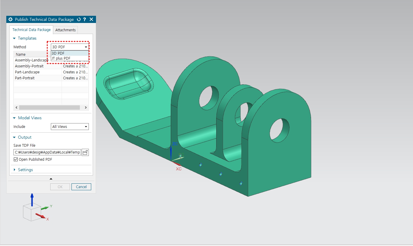 - 파일 형식에서 Publish Technical Data Package를 선택하고, 3D PDF로 저장 옵션을 선택합니다.