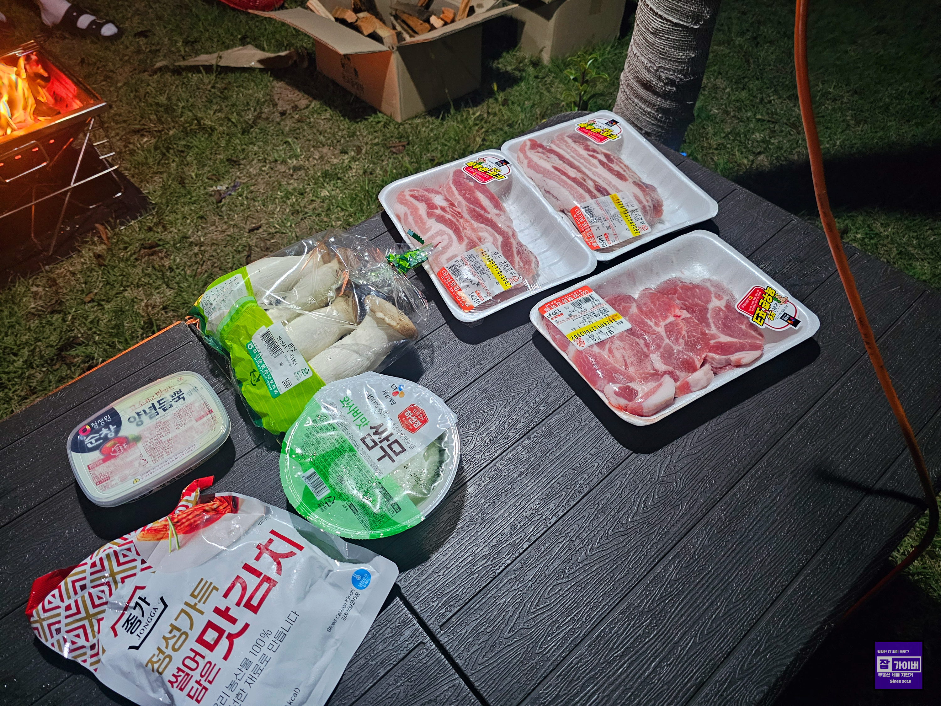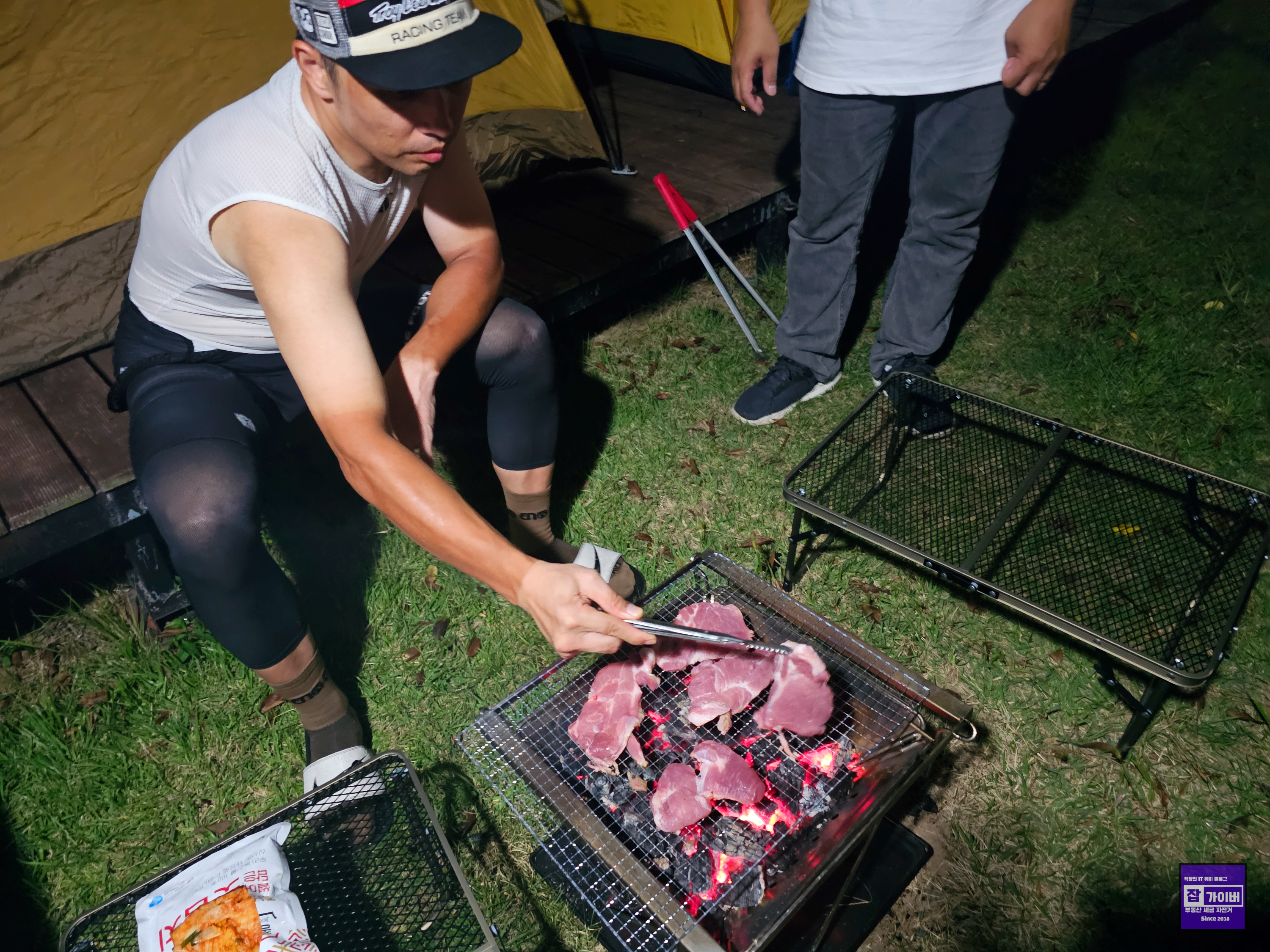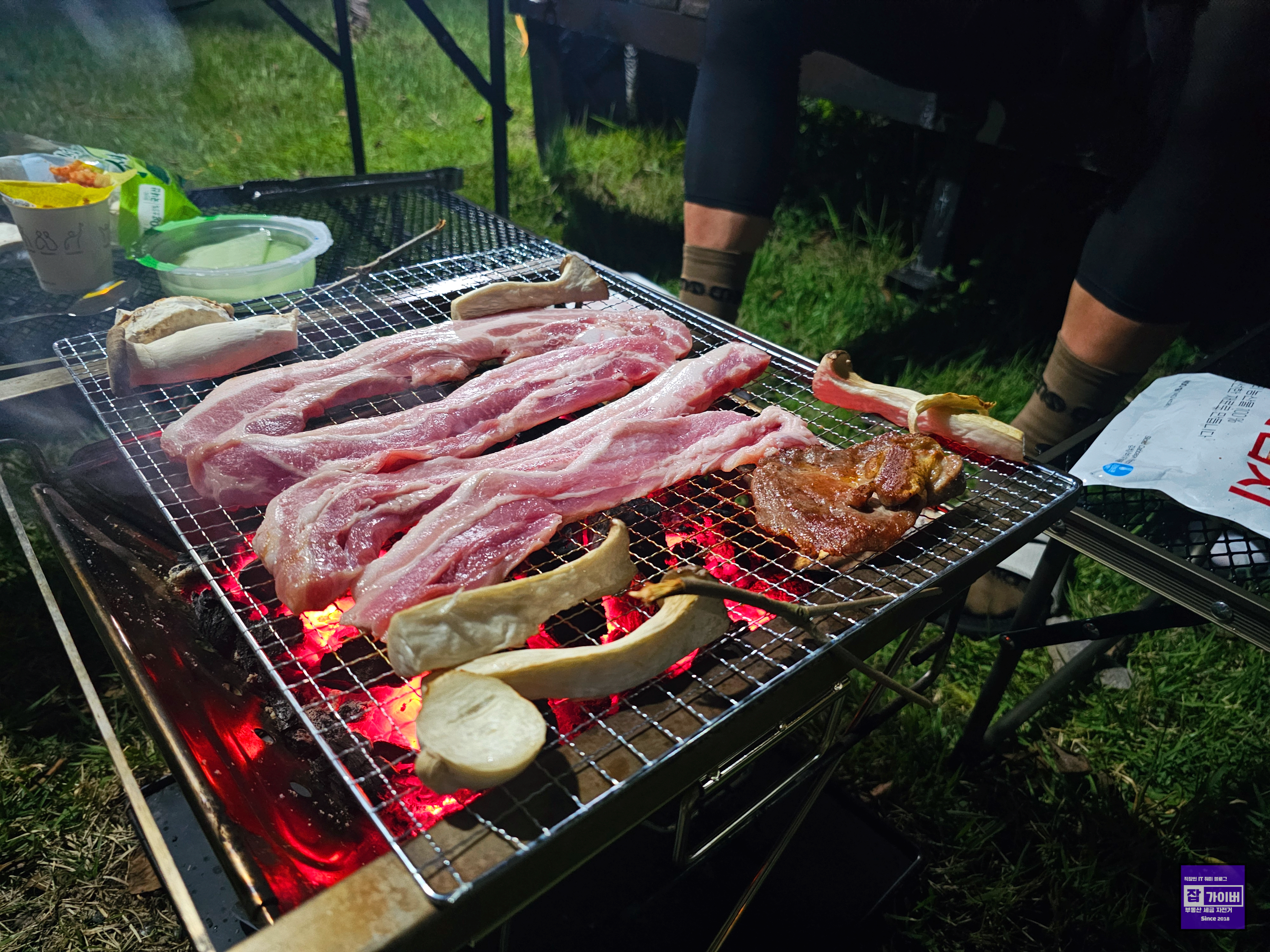 맛있게 구운 고기에서 풍겨 나오는 은은한 숯 향과 바다를 배경으로 하는 캠핑장의 낭만적인 분위기가 어우러져 최고의 저녁을 만들었습니다.