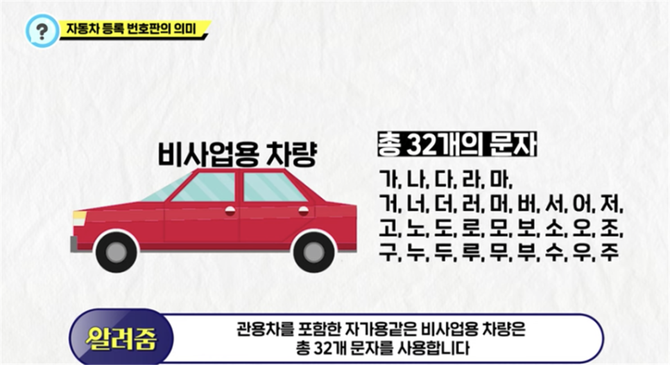 번호판의 색상 외에도 차량 번호판에 표시된 문자는 차량의 용도를 나타냅니다.