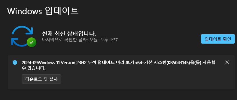 이번 KB5043145 업데이트는 선택적 미리 보기 업데이트로, 설치를 원할 경우 설정 > Windows 업데이트에서 '업데이트 확인'을 통해 수동으로 설치할 수 있습니다.